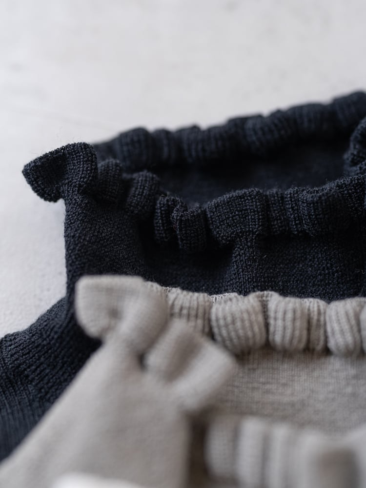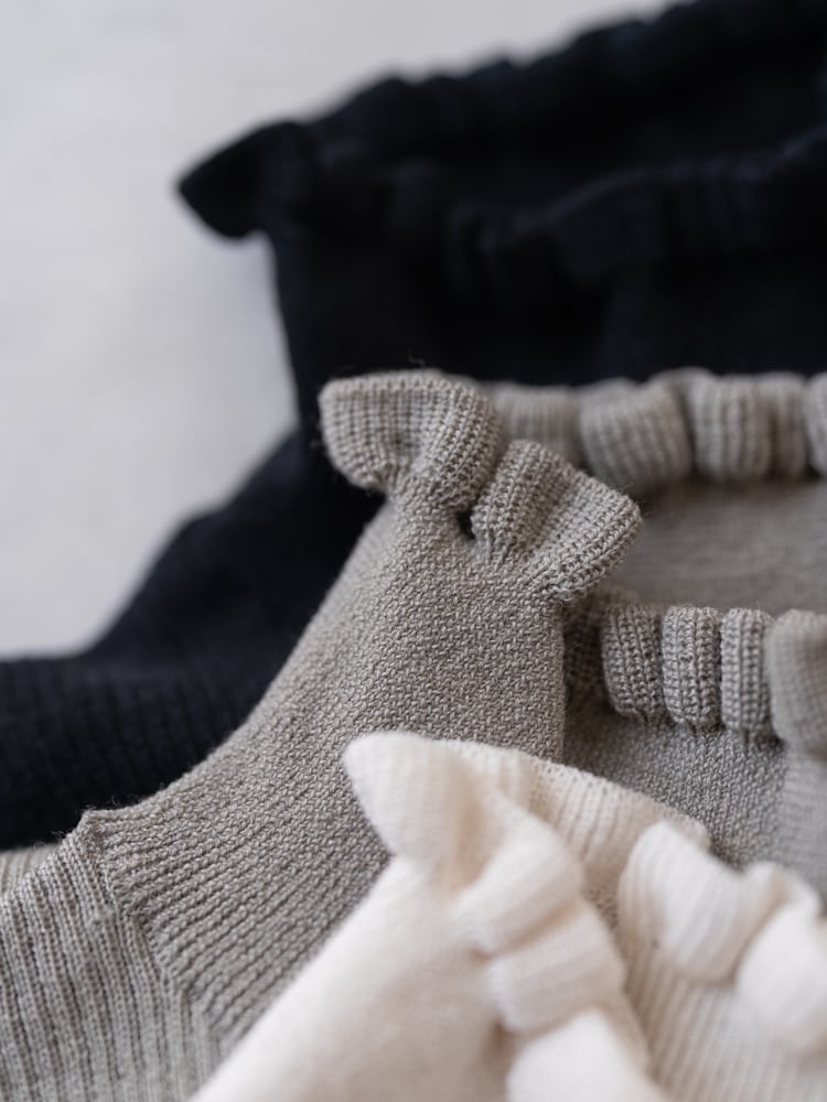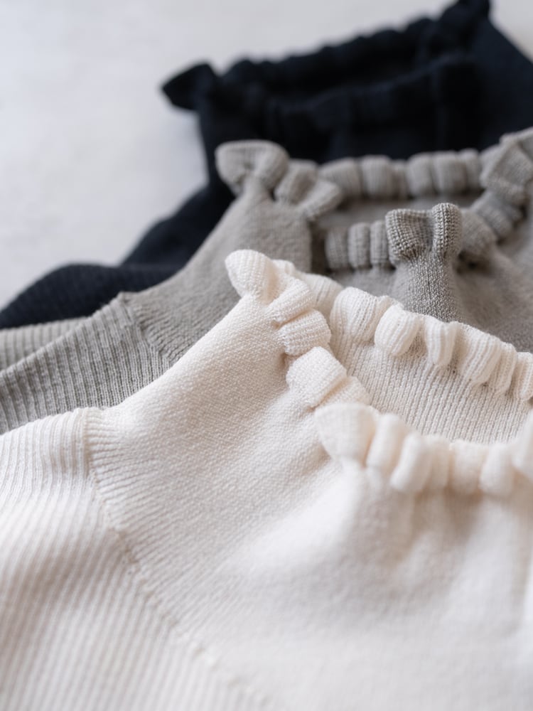 程よいフィット感のサイジングで、首元と袖口にあしらったフリルが、顔まわりや手元に華やかさを演出。肌に直接触れるものだからこそ、ホームクリーニング可能なのも嬉しいポイントです。