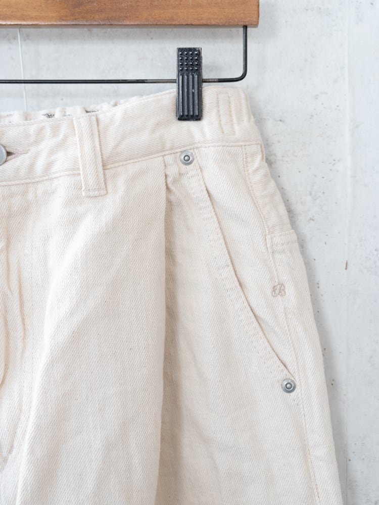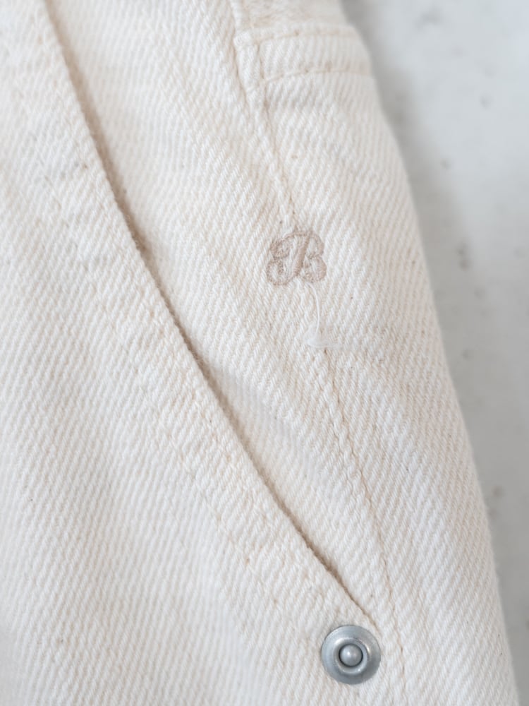 通常より多く糸を飛ばして織る技法で織られている生成りデニムはふくらみ感があり柔らかい生履き心地になっています。