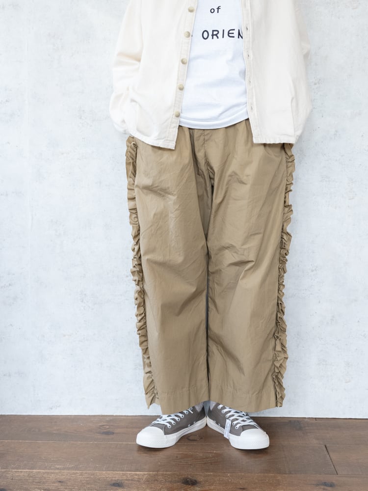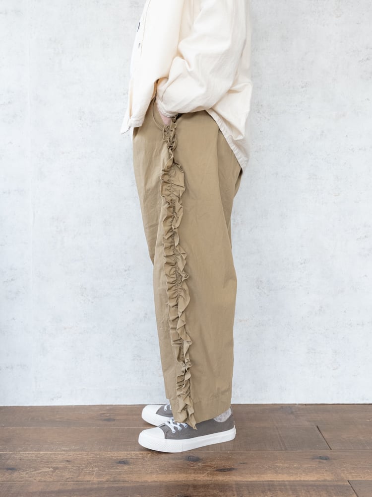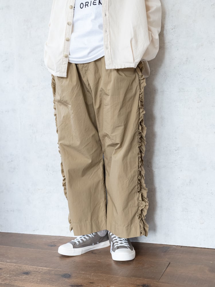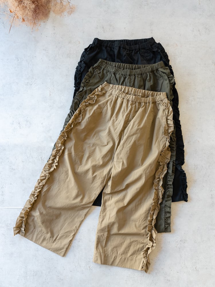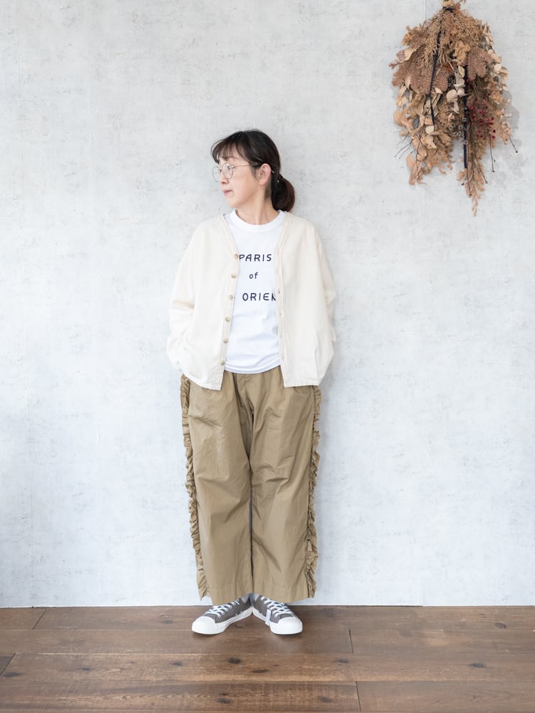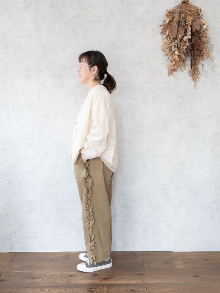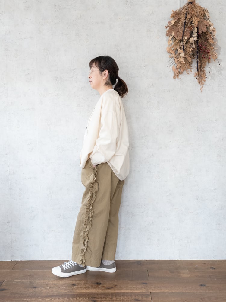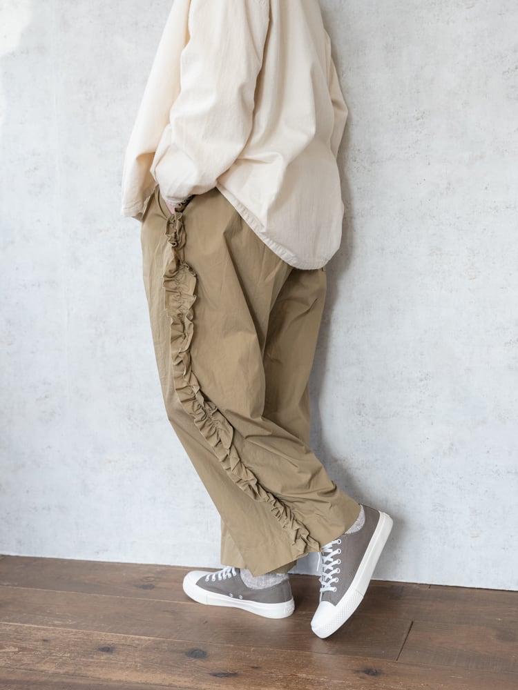 甘くなりがちなフリルも太過ぎないプレーンなシルエットとカジュアルめな素材感で合わせやすく普段のコーディネートに取り入れやすいガーゼらしいパンツになっています。