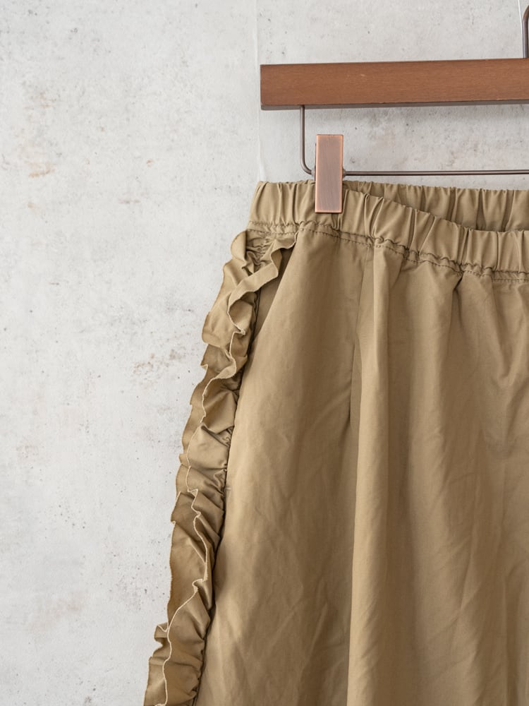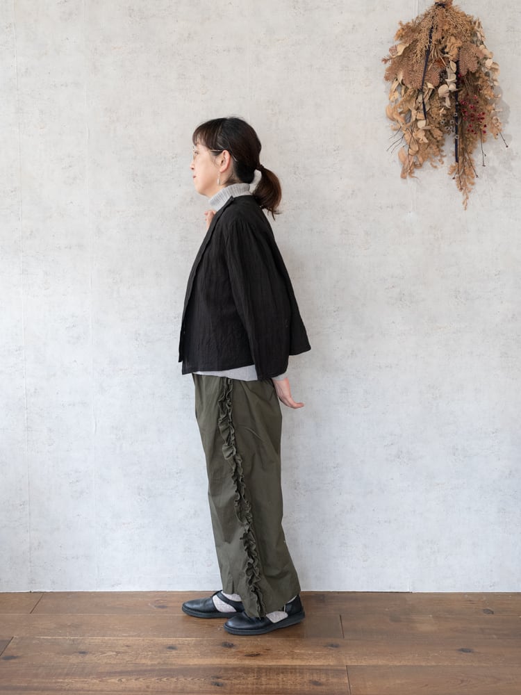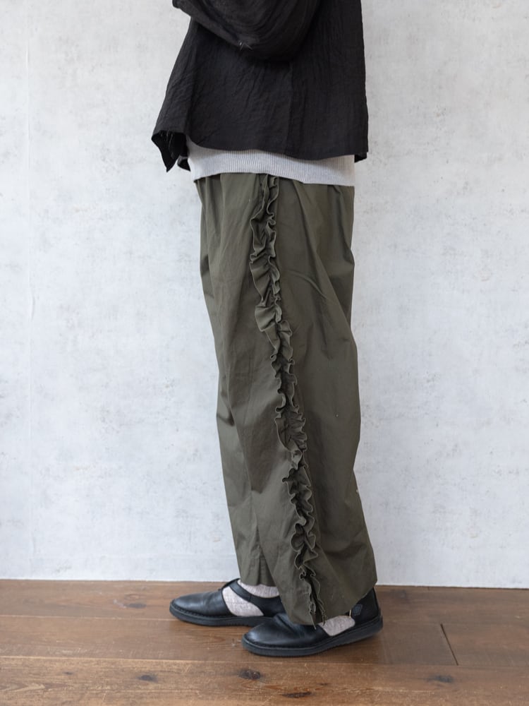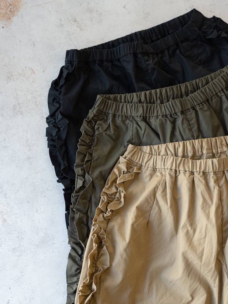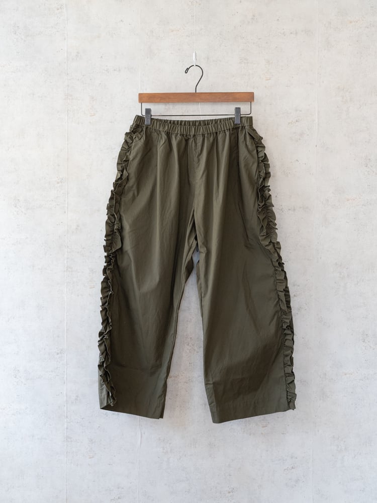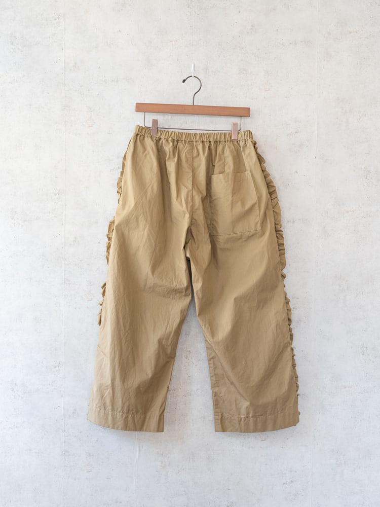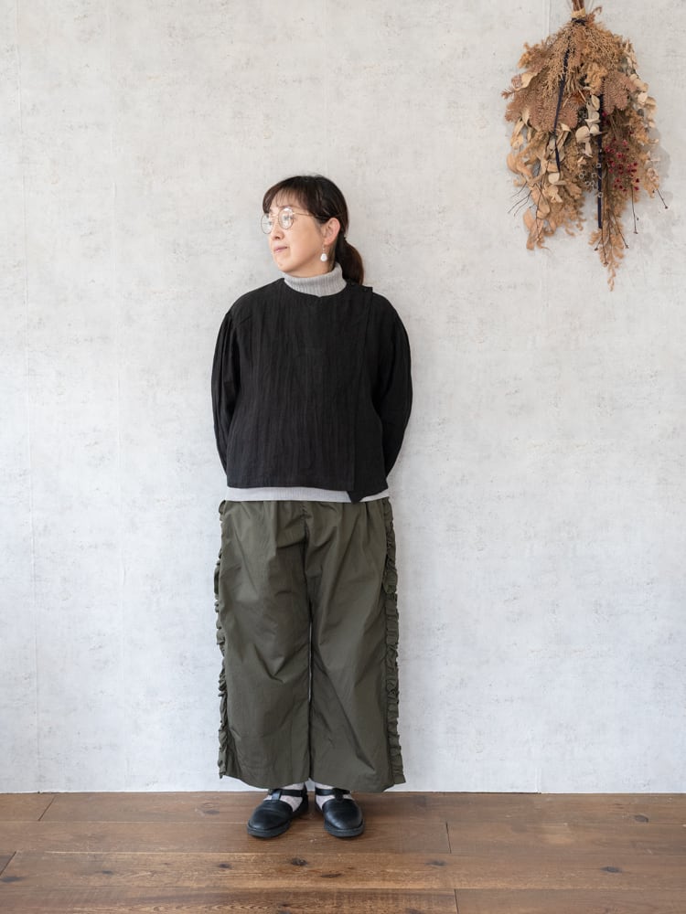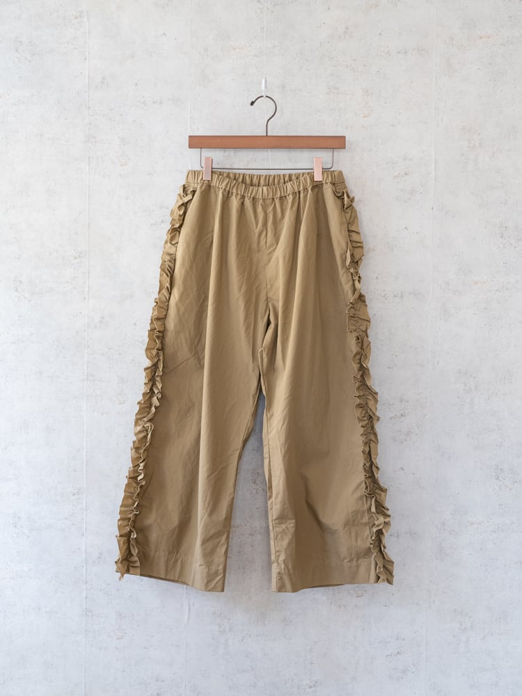 甘くなりがちなフリルも太過ぎないプレーンなシルエットとカジュアルめな素材感で合わせやすく普段のコーディネートに取り入れやすいガーゼらしいパンツになっています。