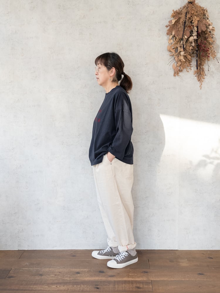 素材はしっかりとした型崩れがしにくさで定評のあるアピースオブライブラリーの定番素材、綿本来のナチュラルで粗野な質感はそのままに柔らかく着心地のいい素材です。