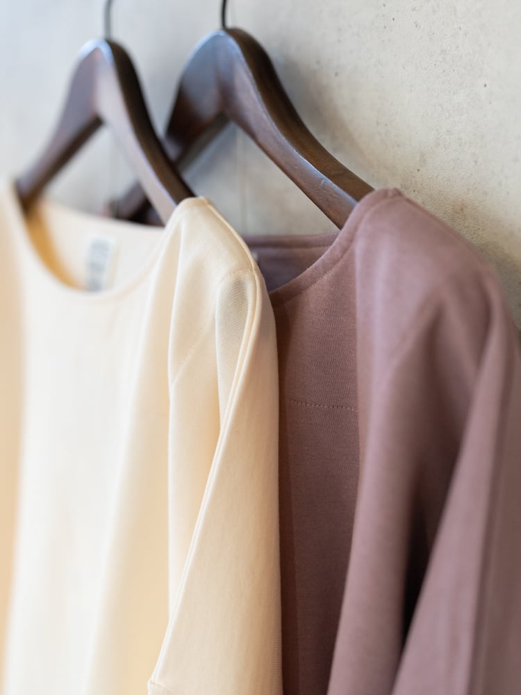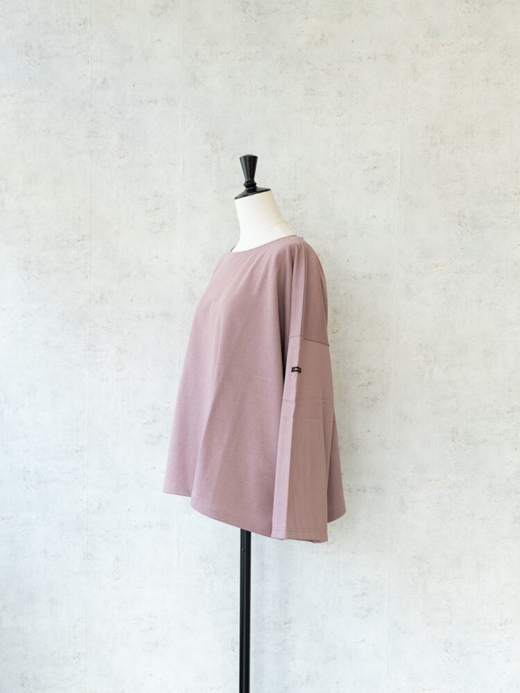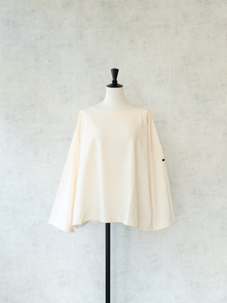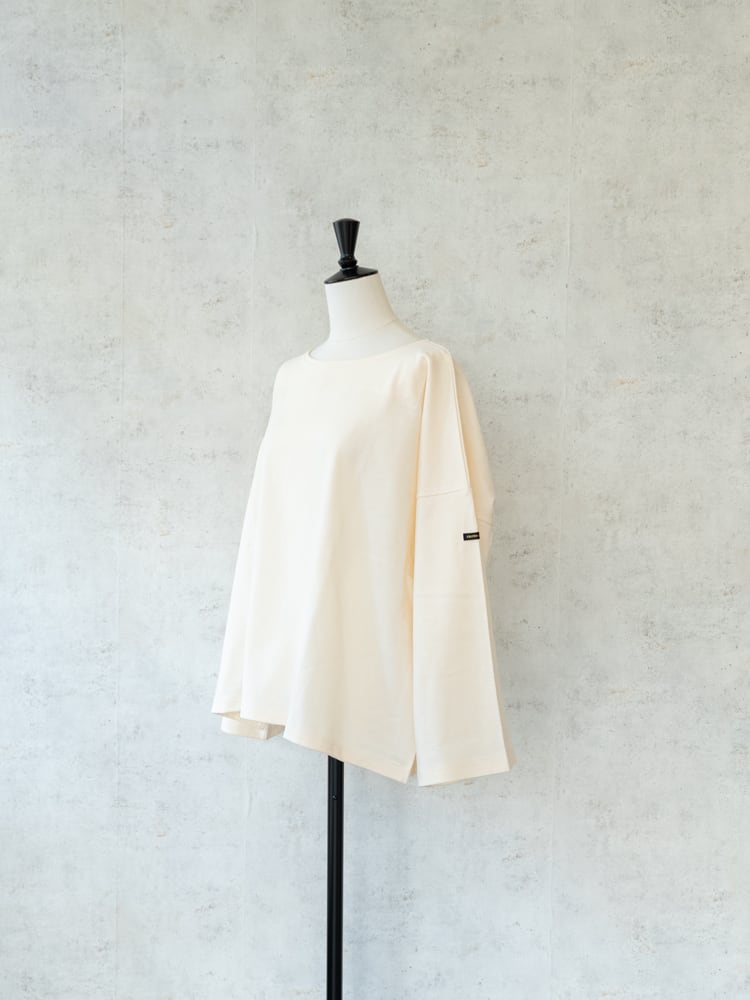 ゆったりとした身幅とドロップショルダーが自然な抜けをつくり出し、上品なボートネックが全体を引き締めてくれます。程よく分量のある袖で、リラックス感の中に落ち着いた印象に。