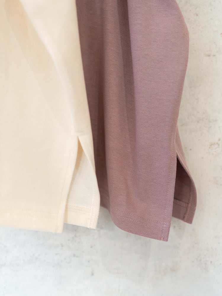 プレーンで合わせやすいワイドシルエットのカットソーに、さりげないこだわりを感じられる一枚です。