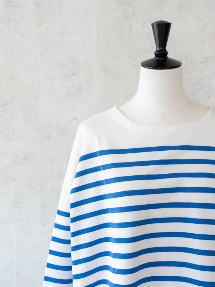 全面をボーダーにするのではなく無地部分を設定し編み立てており、程よく目の詰まった生地感は型崩れしにくく身体の線を拾わない素材になっています。