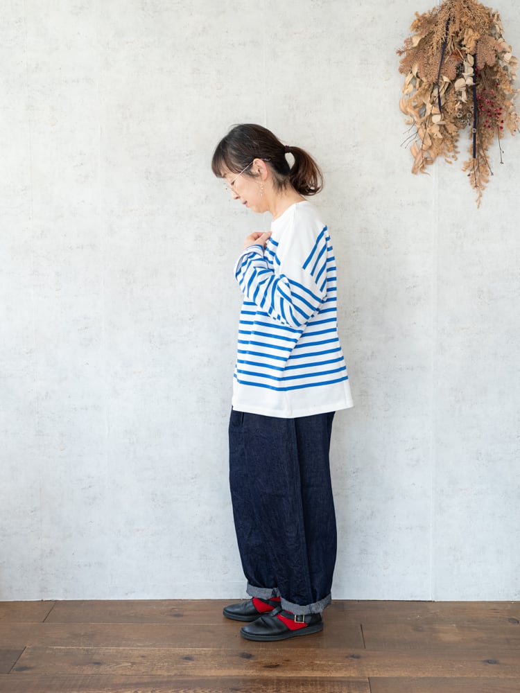 横に広くとった身幅のプルオーバーカットソーは、敢えてのオーバーサイズがかわいく一枚着の他にシャツやタートルネックに重ねた着こなしも楽しんで頂ける仕様に。