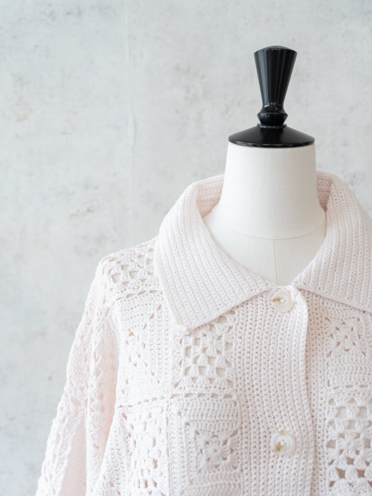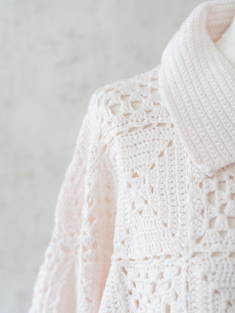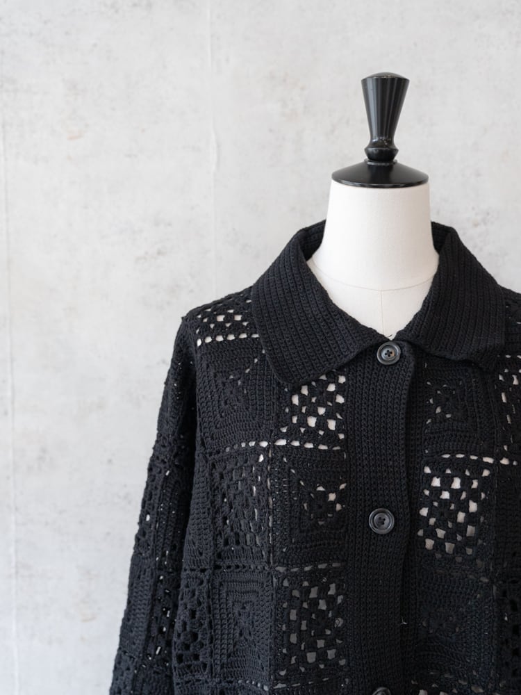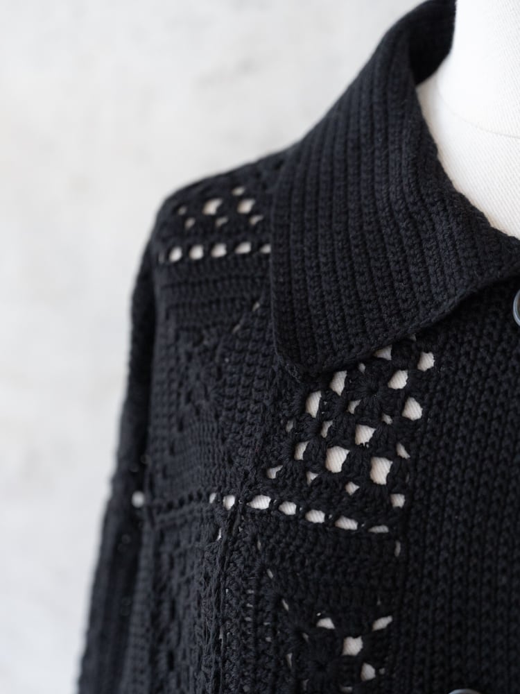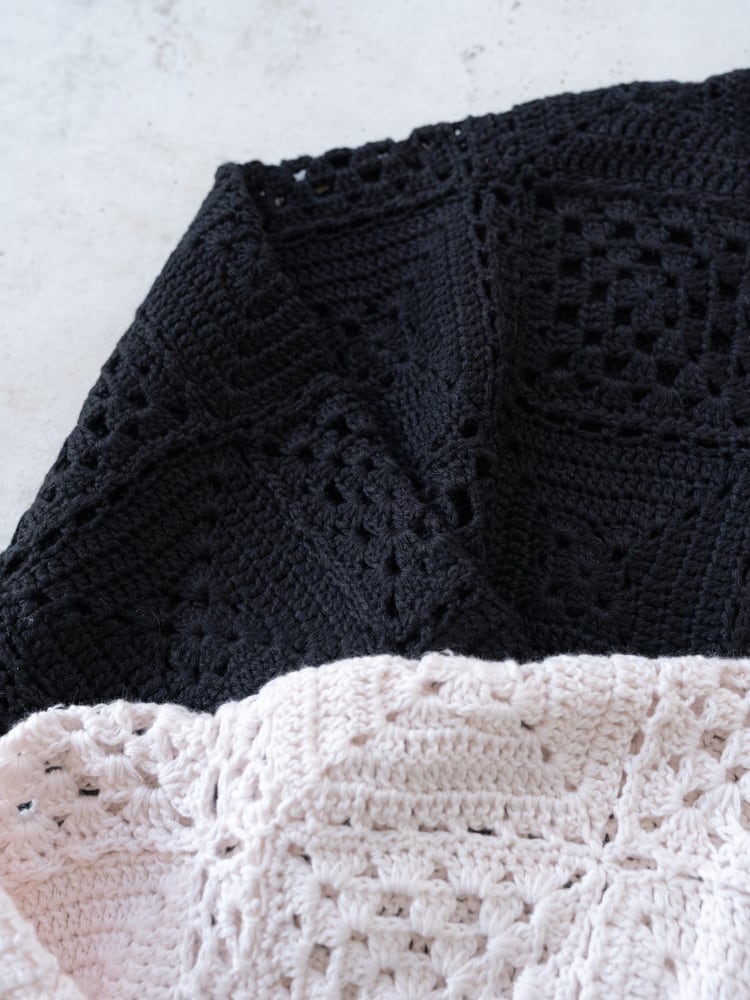 手仕事の温もりを纏う、2種類の異なるスクエアモチーフを贅沢にパッチワークしたモノトーンのクロシェカーディガン。