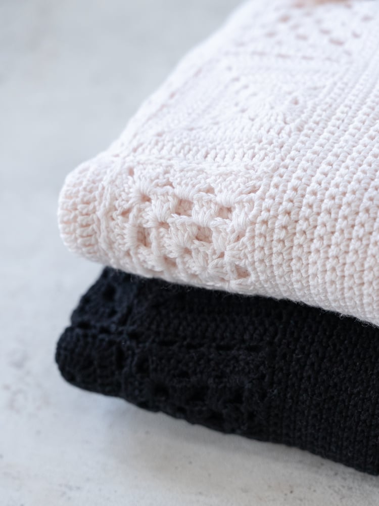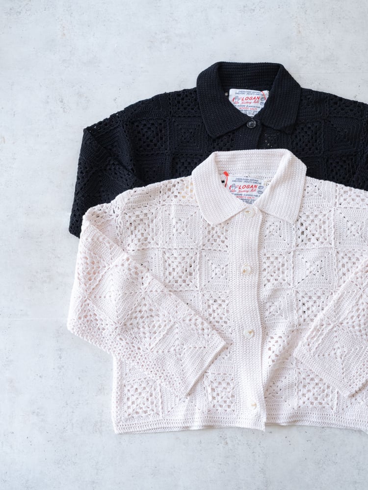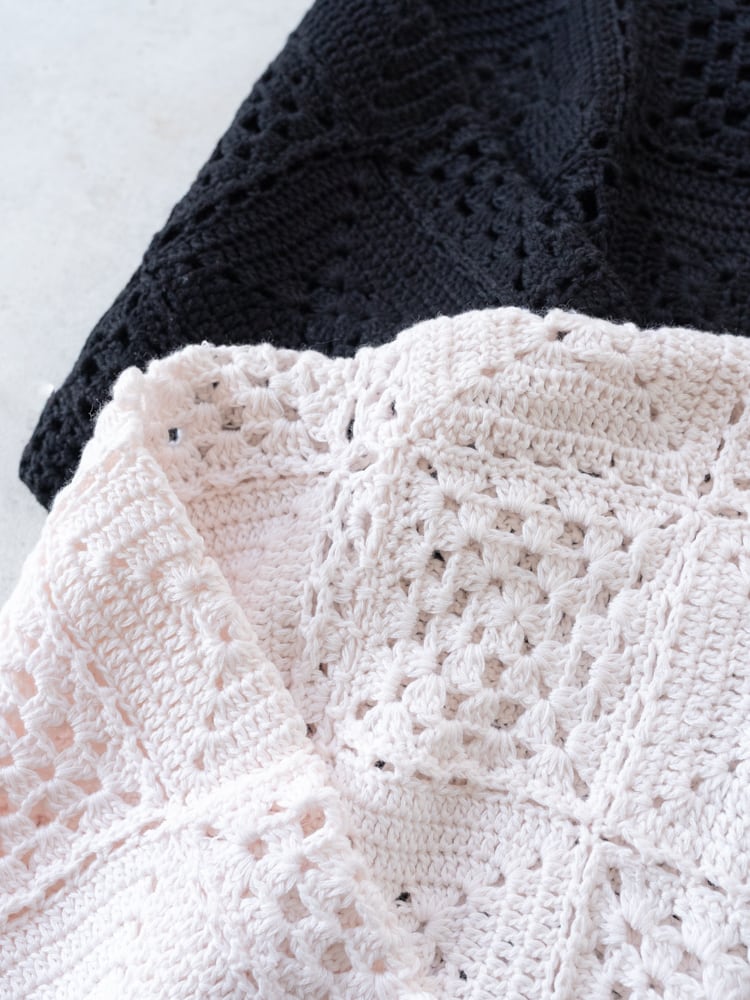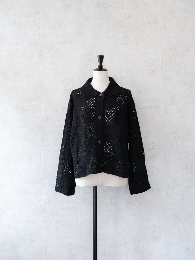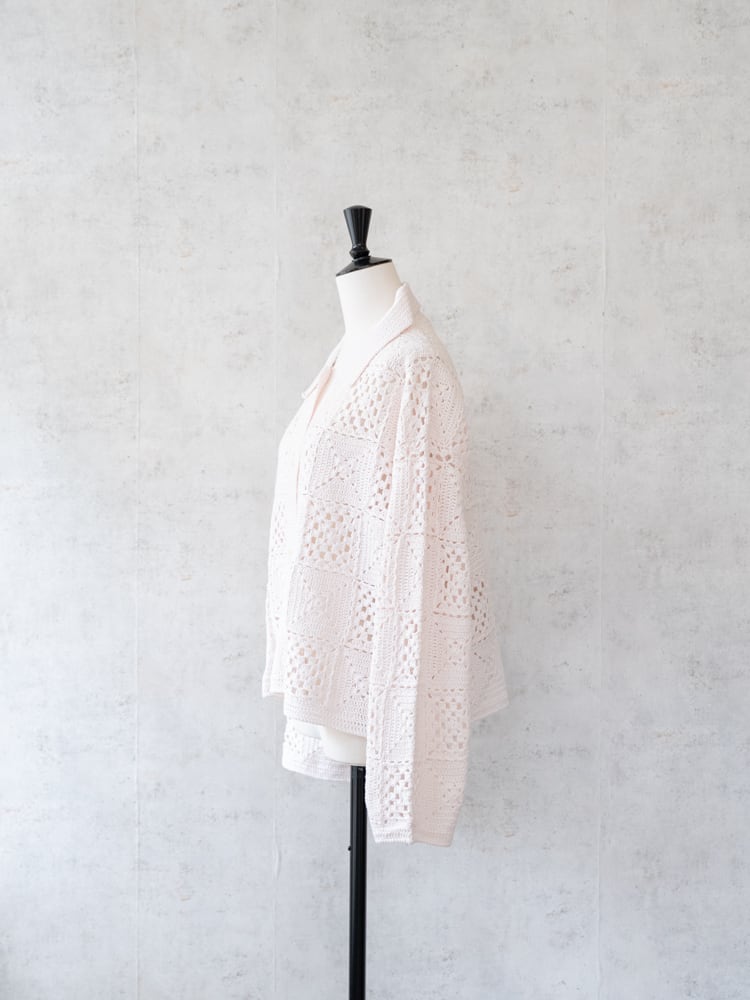 手仕事の温もりを纏う、2種類の異なるスクエアモチーフを贅沢にパッチワークしたモノトーンのクロシェカーディガン。