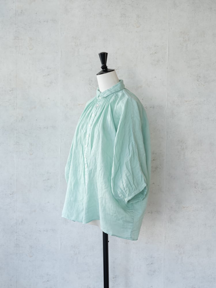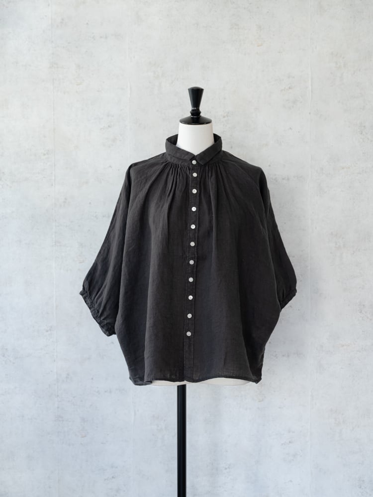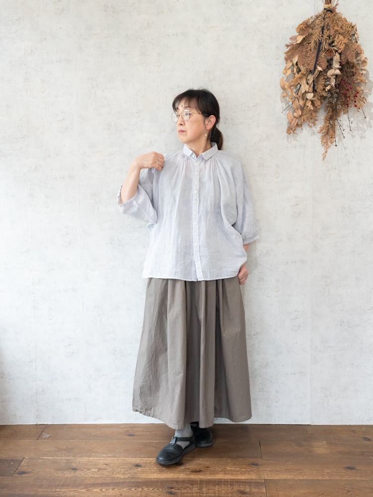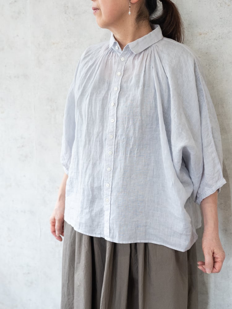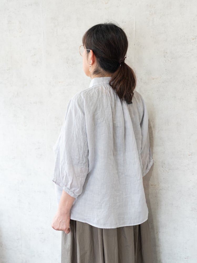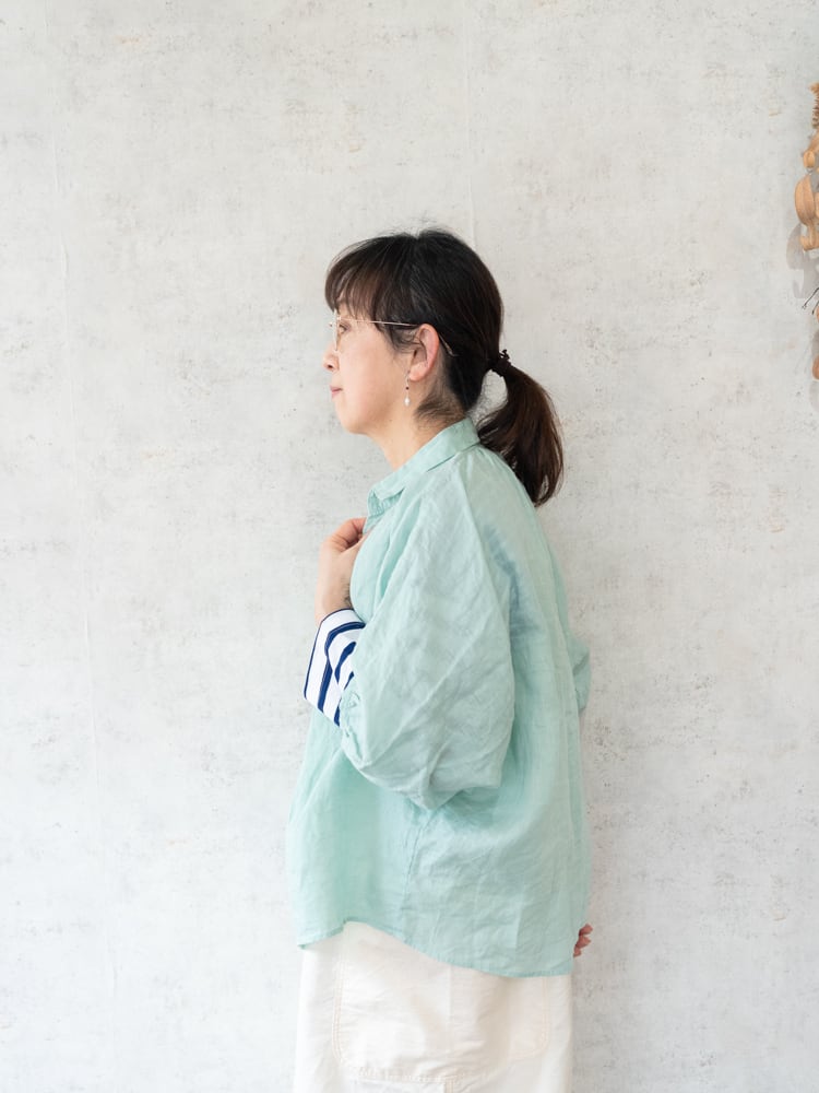 とても柔らかいリネン素材で肌に直接触れてもチクチク感が少なく一枚着でも着心地のいいアイテム。薄手のカーディガン代わりとしても活躍してくれる重宝間違いなしなブラウス。