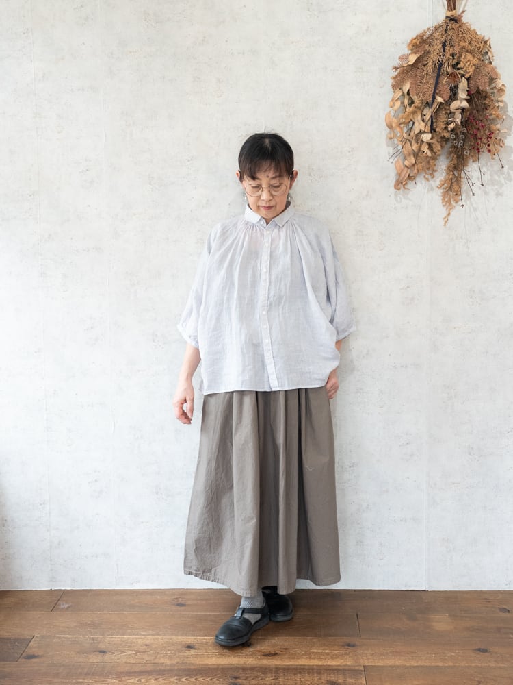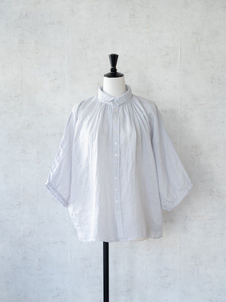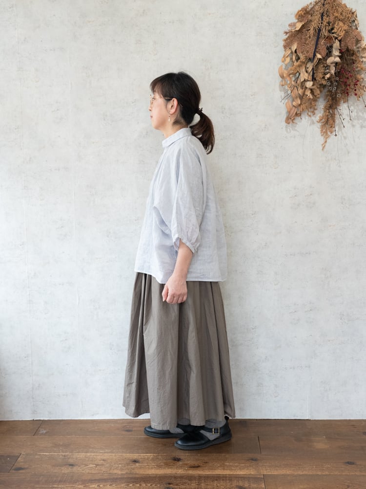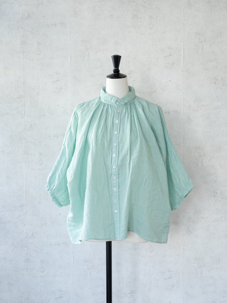 女性らしい小振りな襟と前後ともに細かくギャザーを寄せることで顔周りに上品なアクセントになったブロカント人気定番ブラウス。