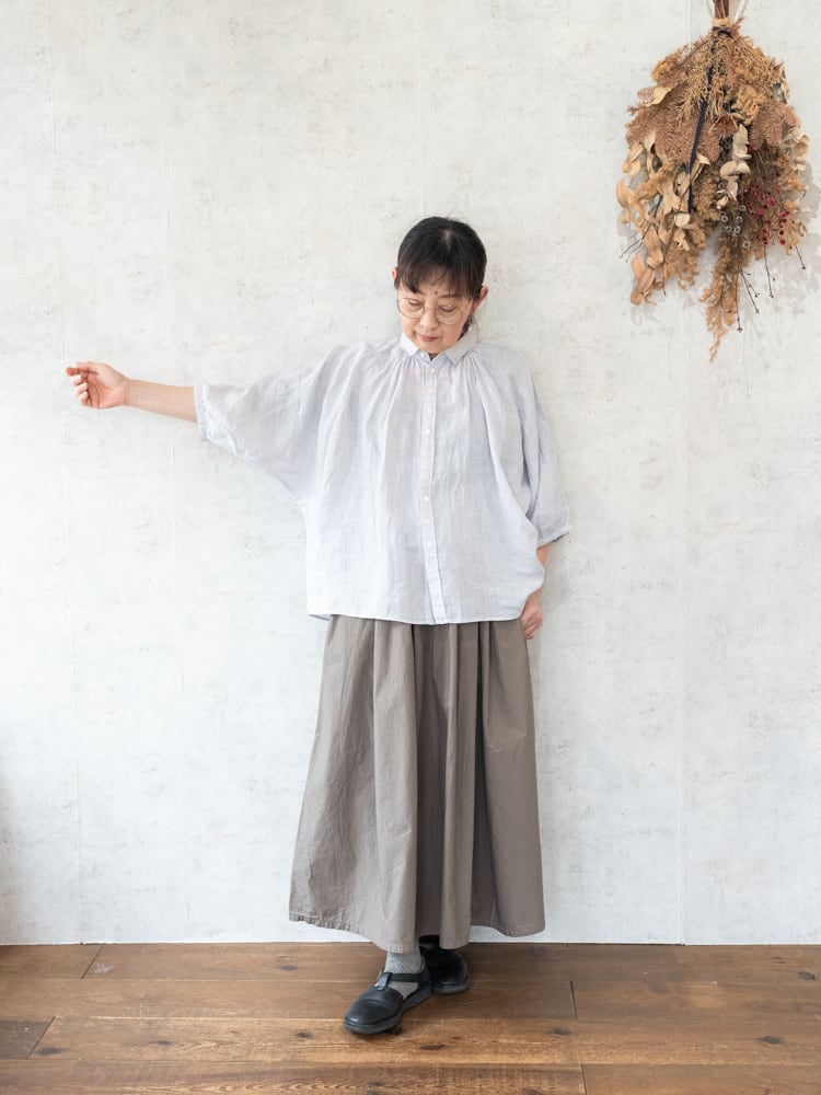 ドルマンスリーブでリネン生地が作り出す揺らぎとドレープ感のあるふんわりとしたフォルムが絶妙なシルエットバランスに。