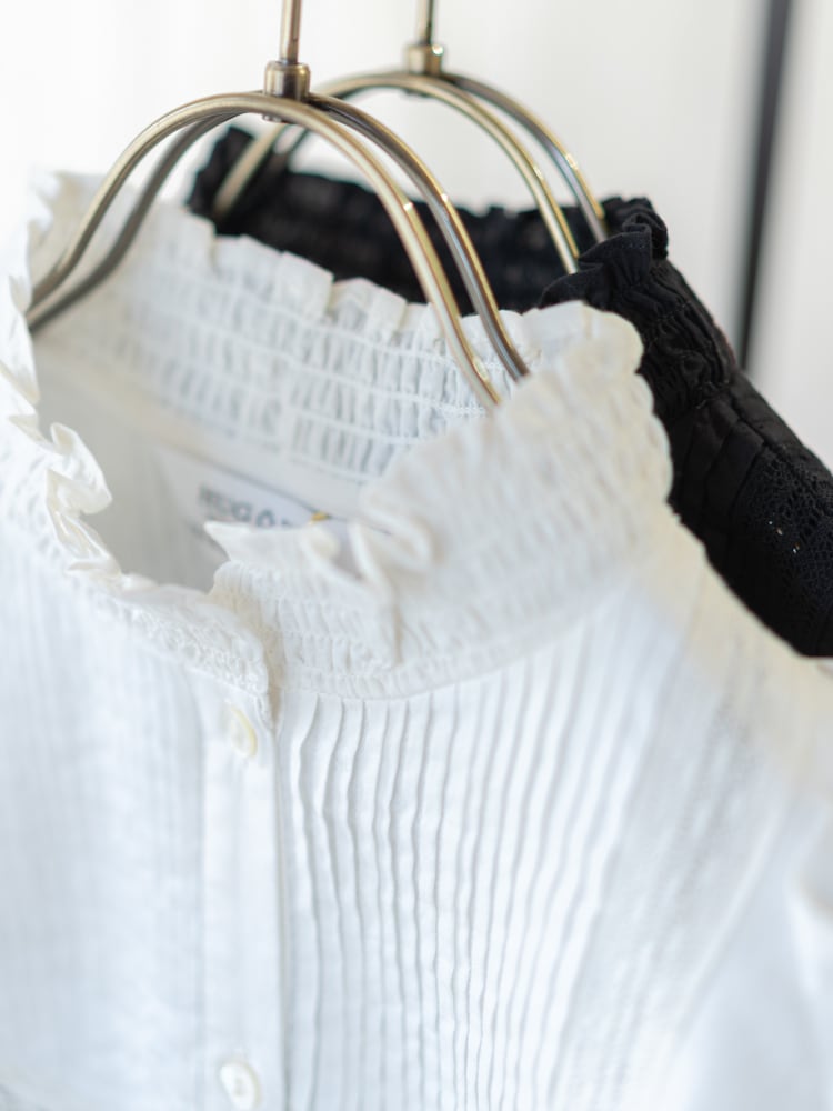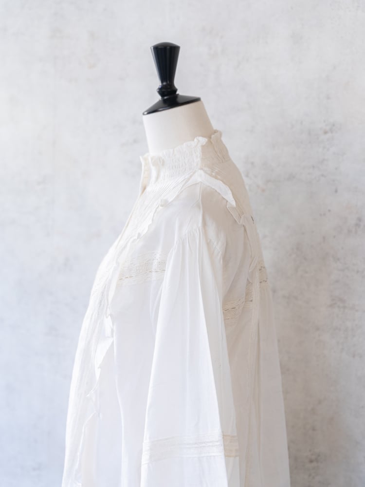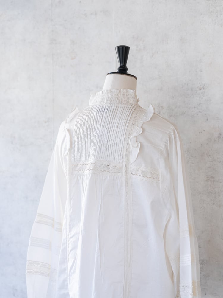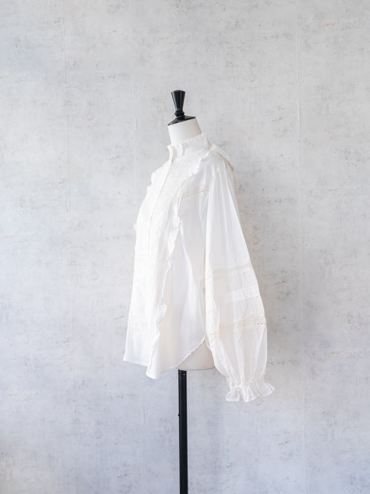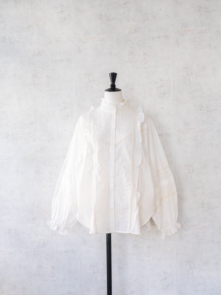 インド綿を使用したほんのり艶のあるコットンキャンブリックを使用したロマンティックな空気を纏う気品あふれるヴィクトリア調のブラウス。