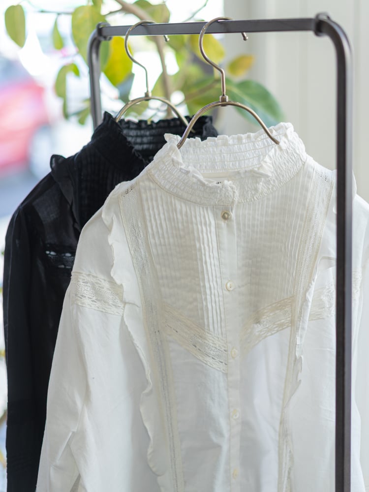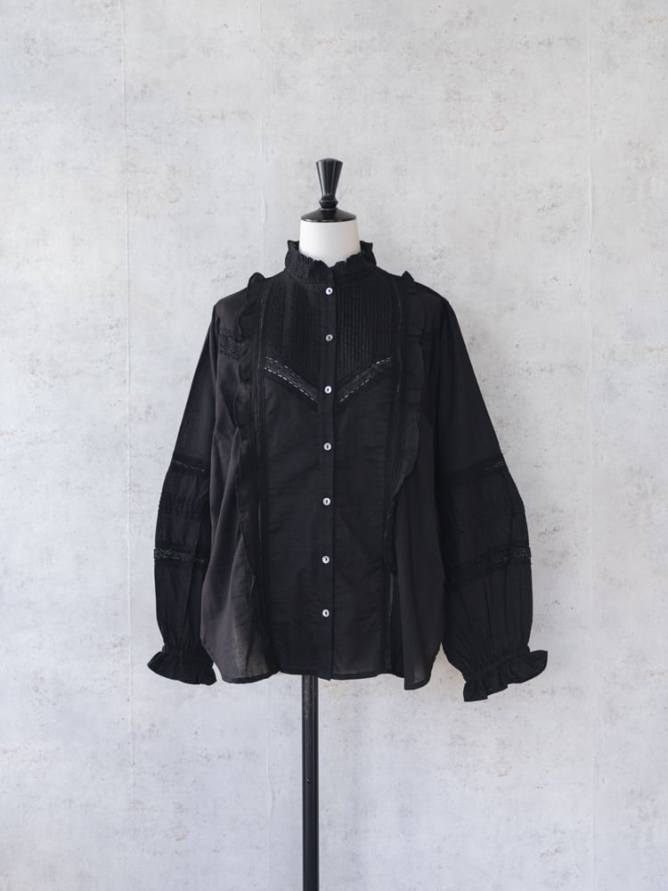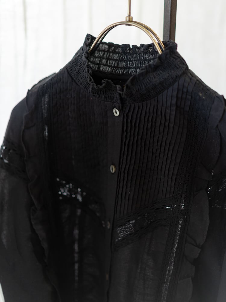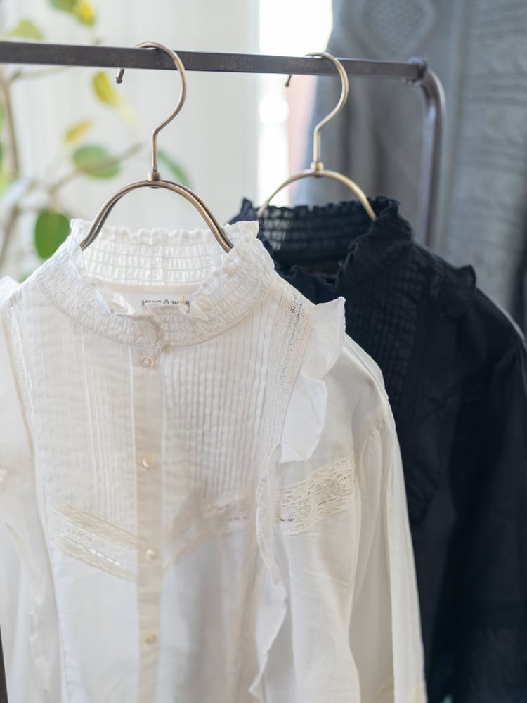 シャーリングをほどこしたフリルのスタンドカラーと、2種類のレースをあしらった袖、ふんわりと立体感のあるシルエットが、クラシカルなムードをいっそう引き立てます。