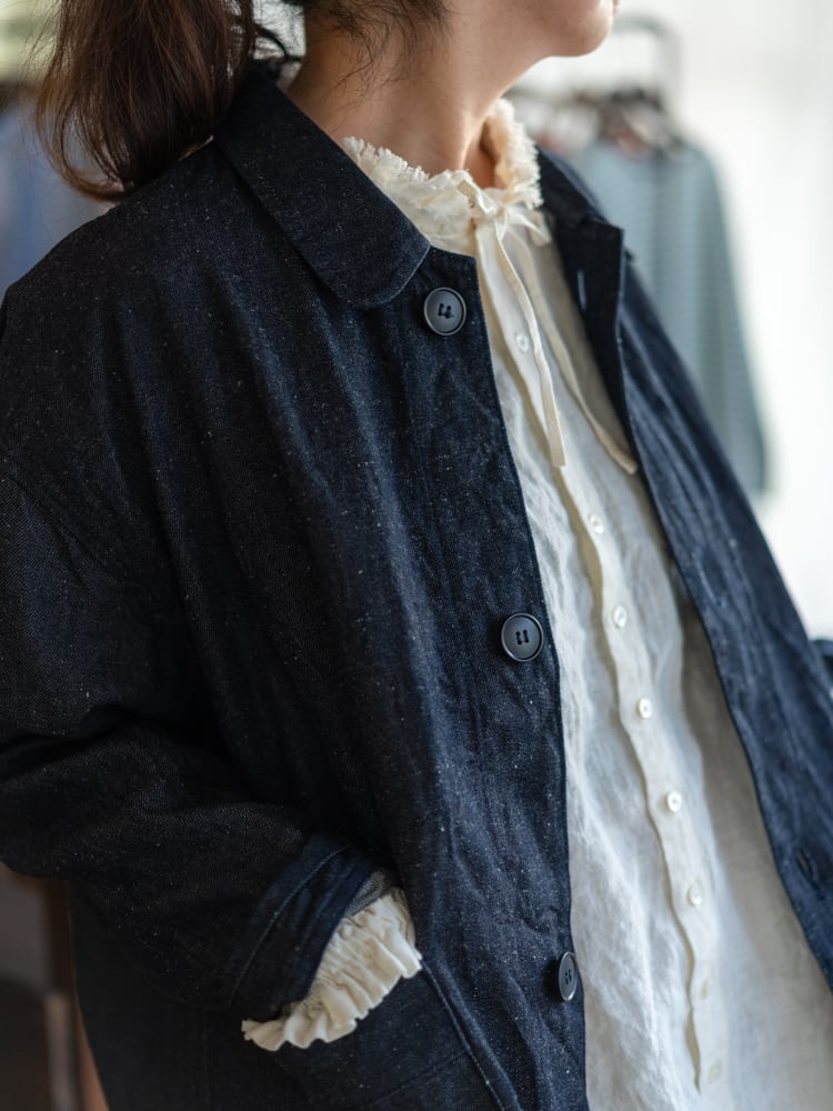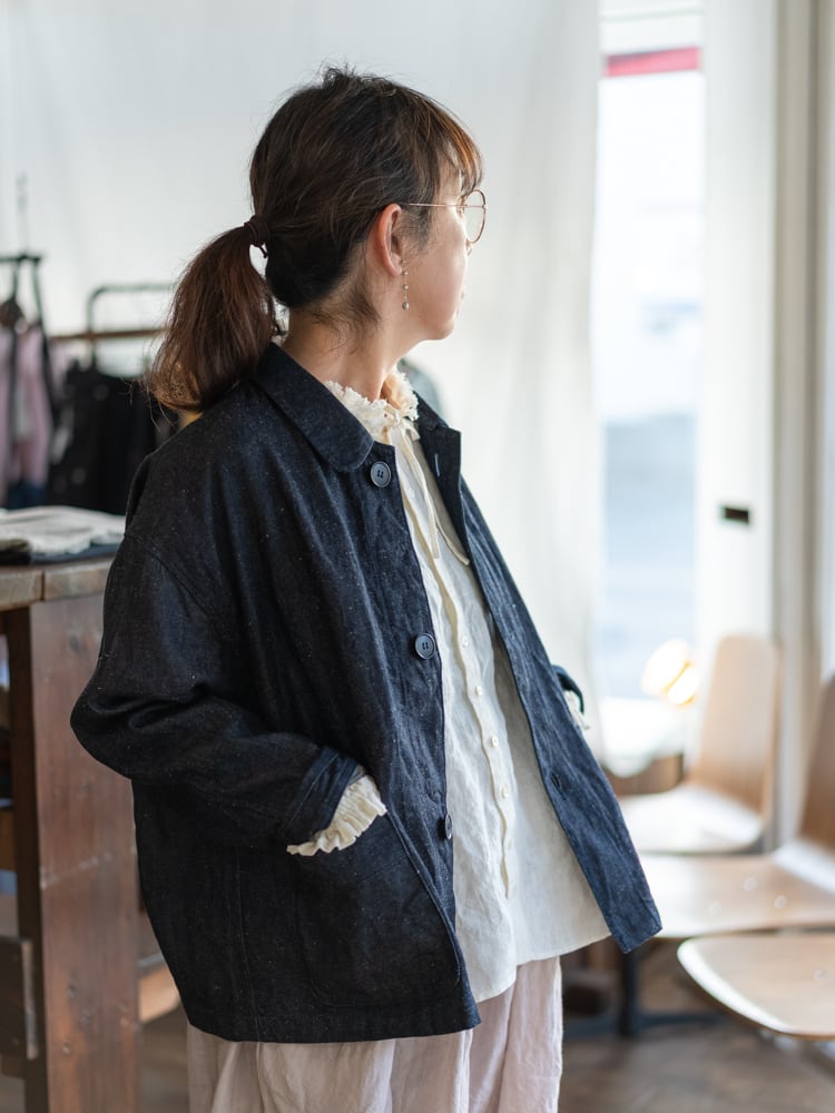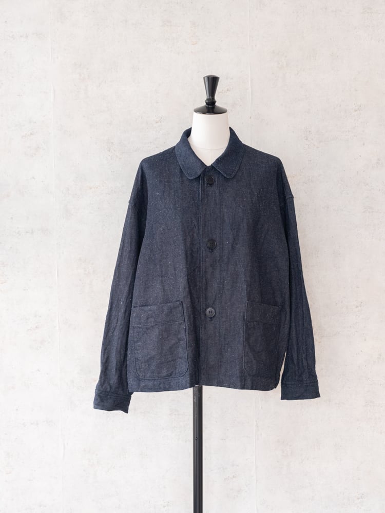 フランスのワークウェアのスタイルを取り入れたシンプルで洗練されたデザインのネップデニムフレンチワークジャケット。