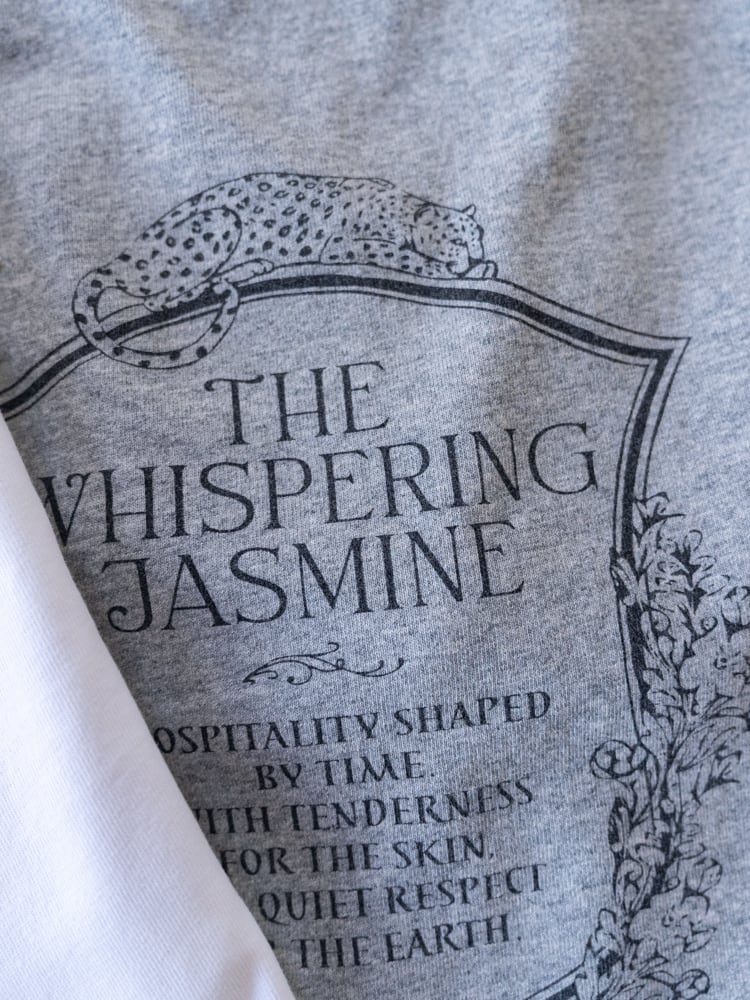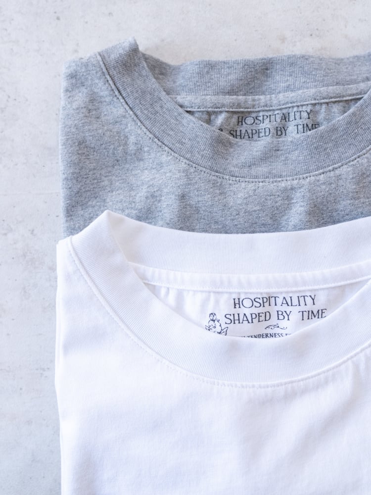 フロントだけでなく背中にも、このシリーズ共通のコンセプトであるフレーズを添えて。パウダーブリーチによって風合いを増したなめらかなコットン生地が、優しく体を包み、ストレスフリーな着心地を叶えてくれます。