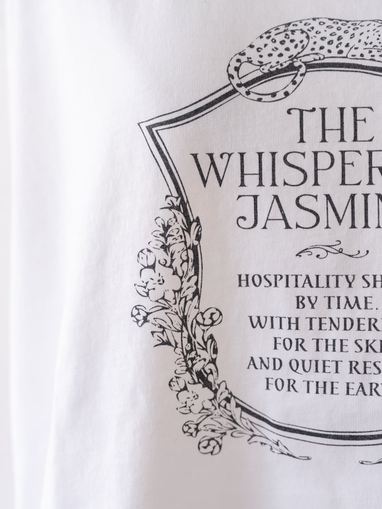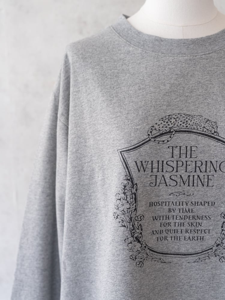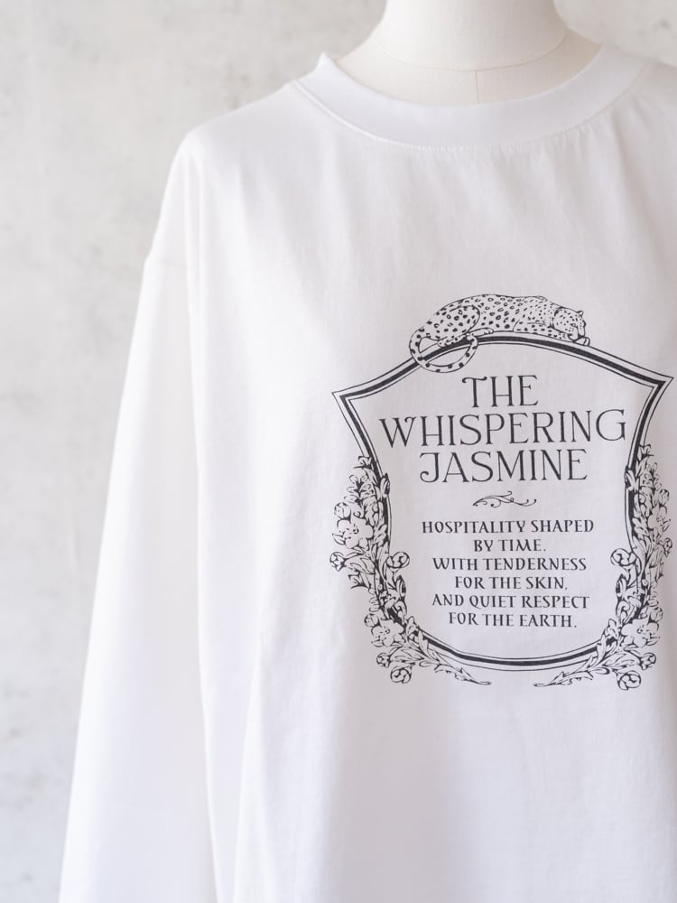 バスルームに置かれた石鹸やパフュームのラベルを思わせる、甘く爽やかな香り「THE WHISPERING JASMINE(ジャスミンの囁き)」をイメージしたデザインです。緻密に描いた花々やレオパードのモチーフを重ね、洗練されたクラシカルな表情に仕上がっています。