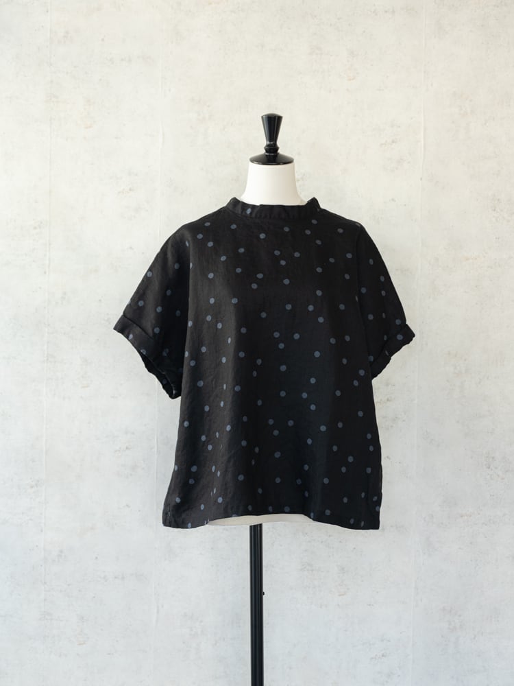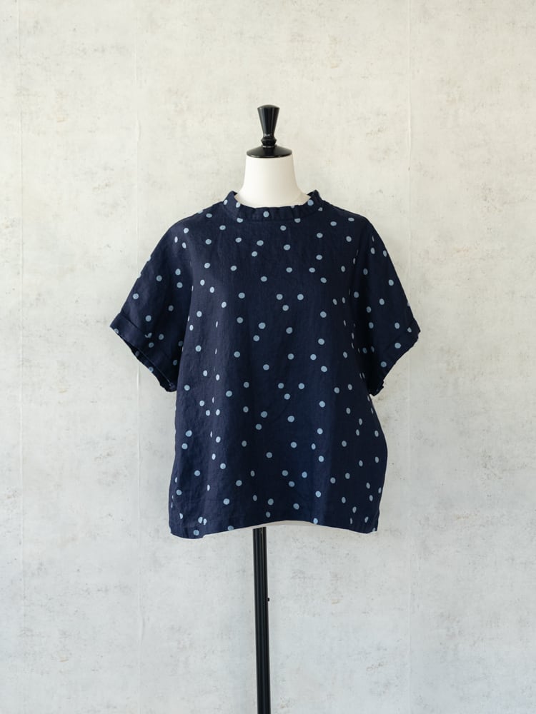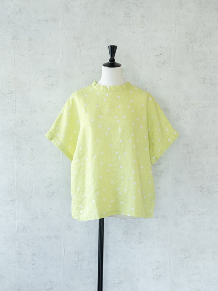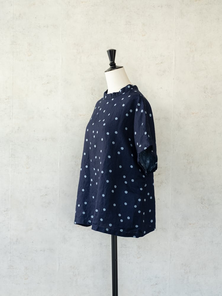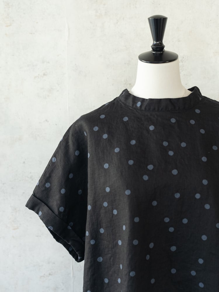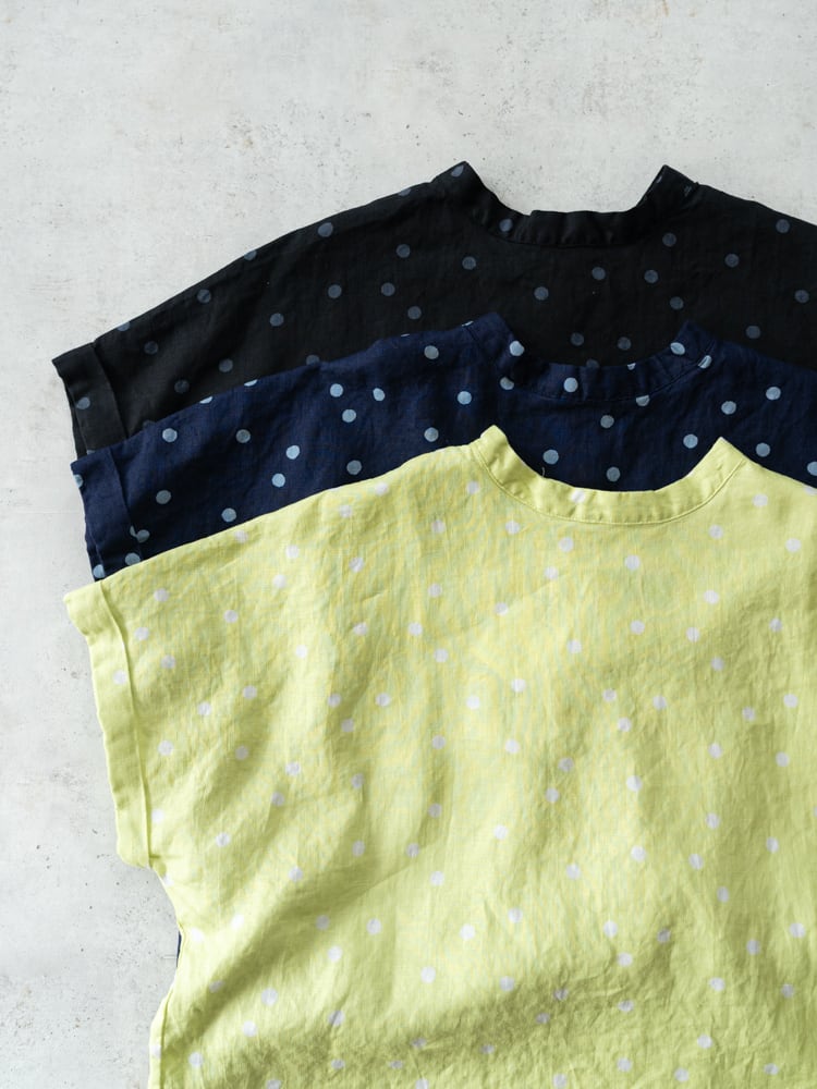 ナチュラルな雰囲気のあるランダムなドット柄のリネン布帛生地をTシャツのようなデザインに仕上げたブラウス。