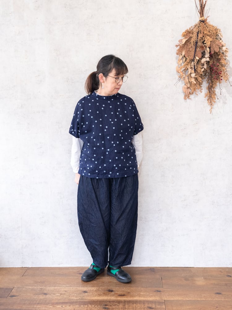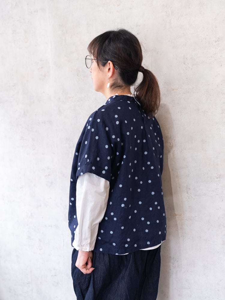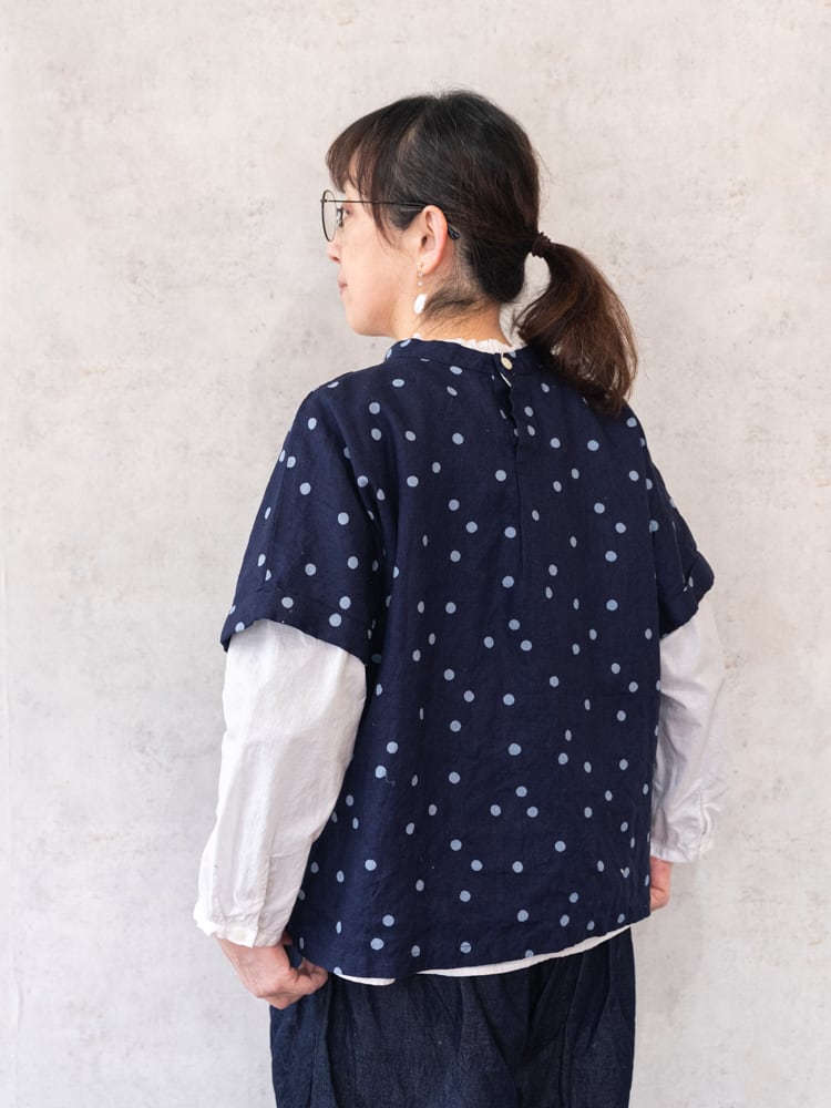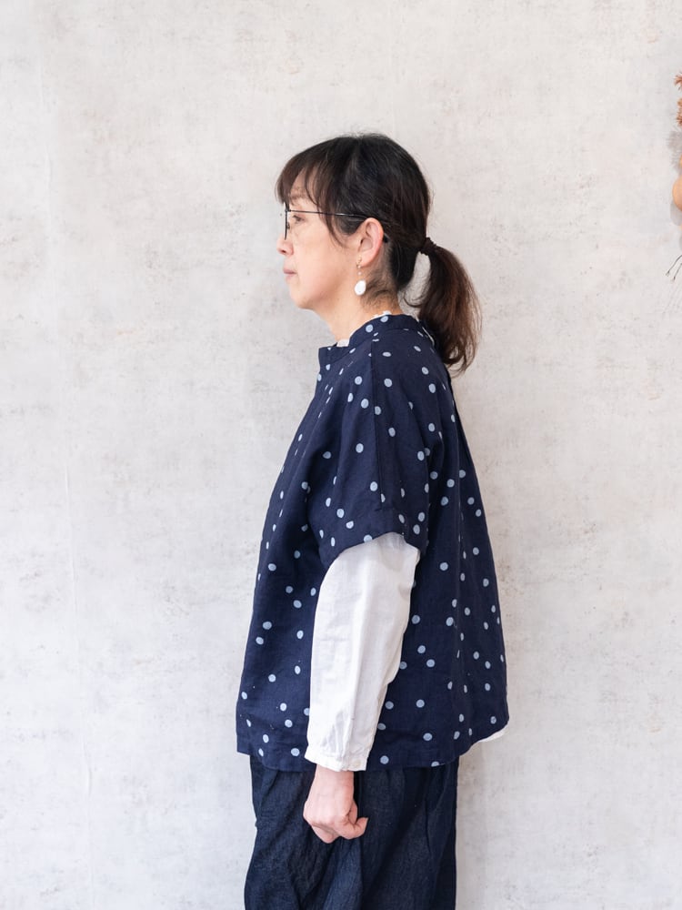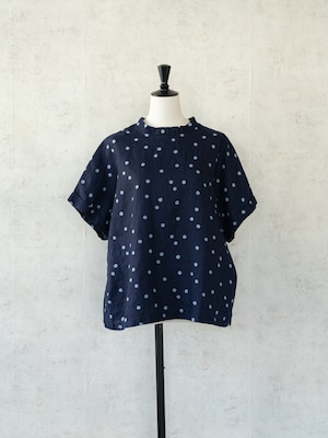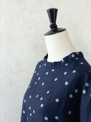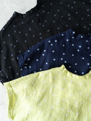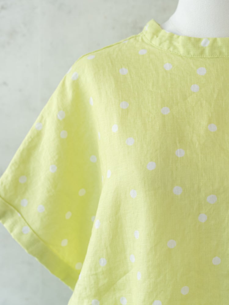 ナチュラルな雰囲気のあるランダムなドット柄のリネン布帛生地をTシャツのようなデザインに仕上げたブラウス。
