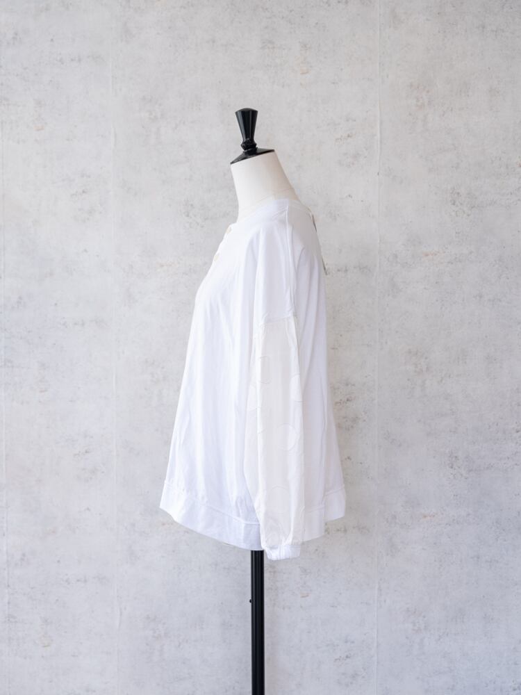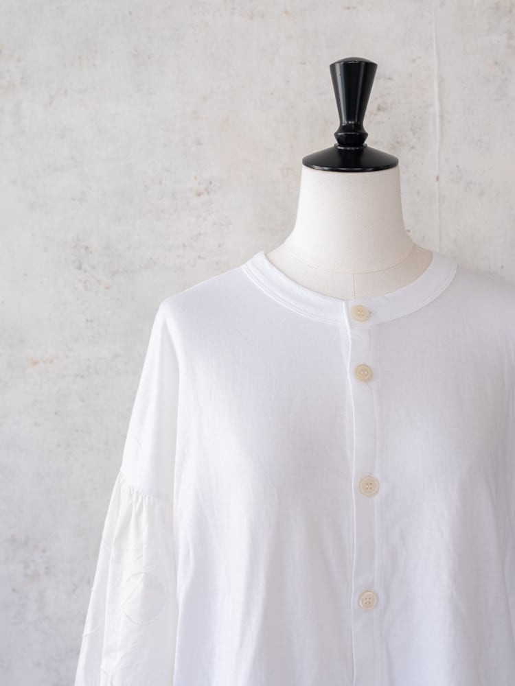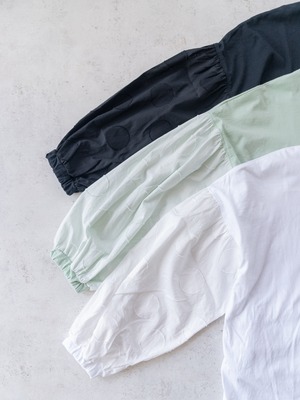 ゆったりとしたサイジングで、ふんわりとした袖が特徴的です。袖先はゴム入りのギャザーを施し、手元に華やかさを添えるだけでなく、袖が捲りやすくなる機能性も担っています。