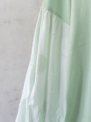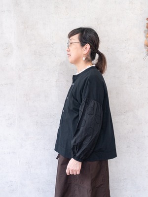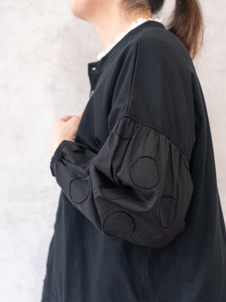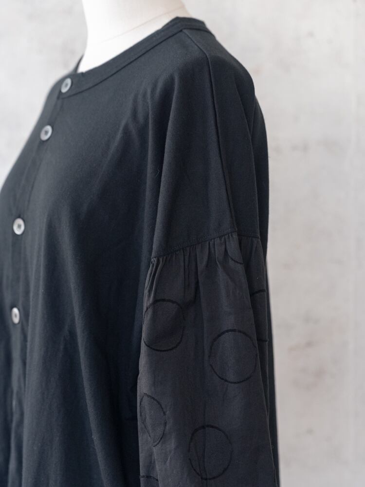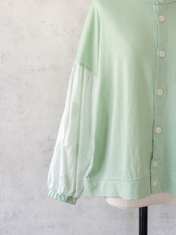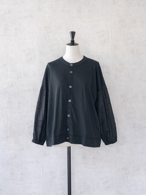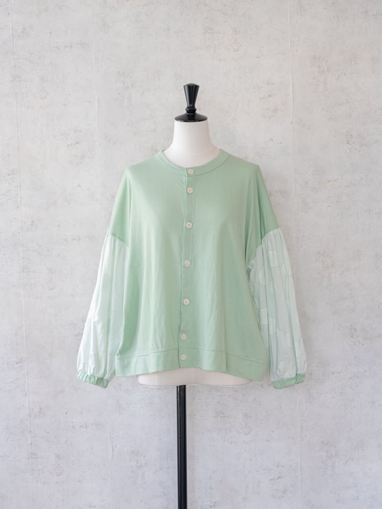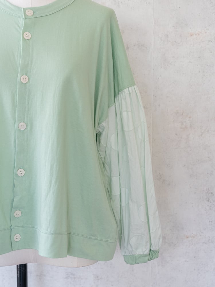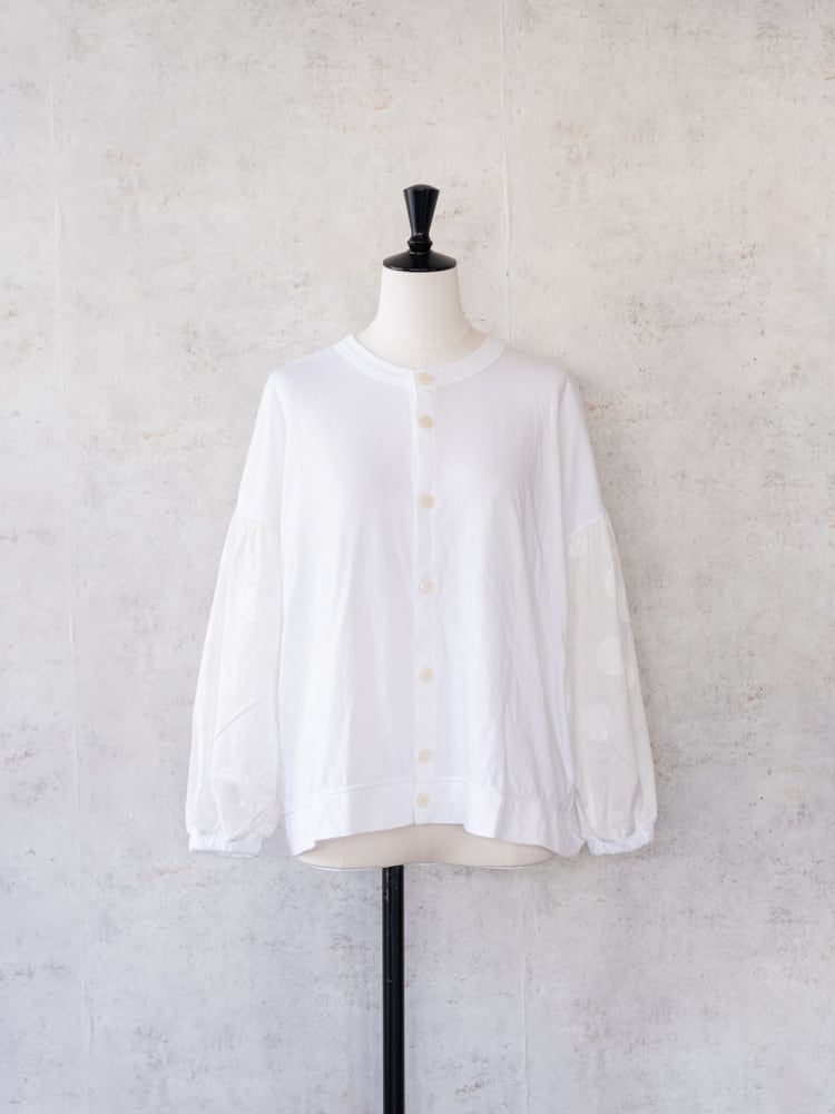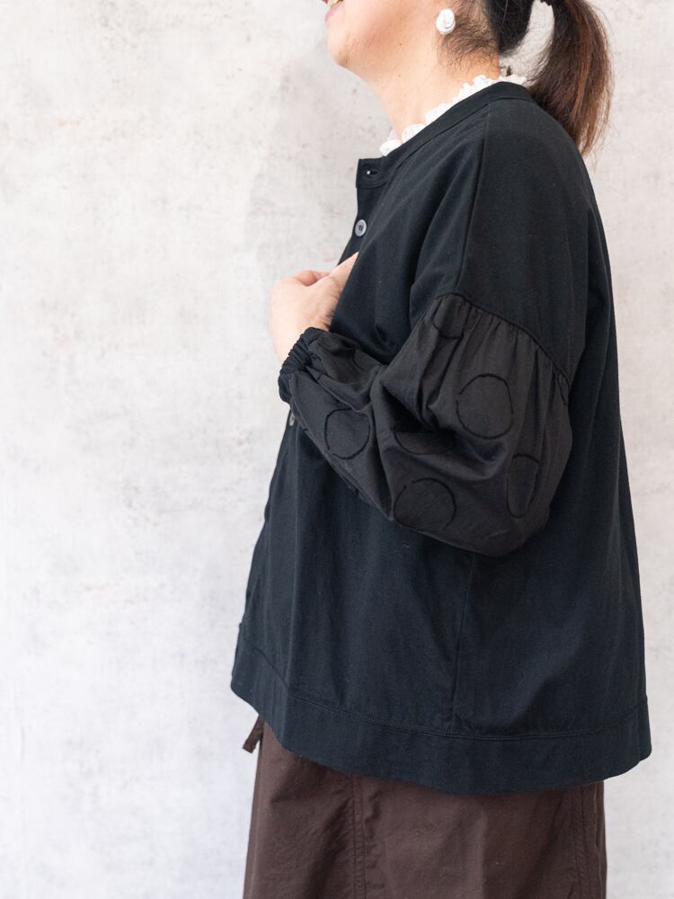 身頃にカットソー、袖部分はサークル刺繍の布帛と異素材を組み合わせたデザインのカーディガン。