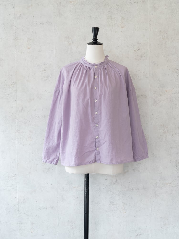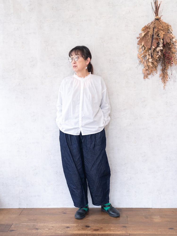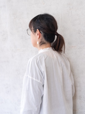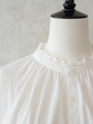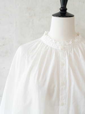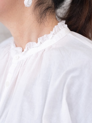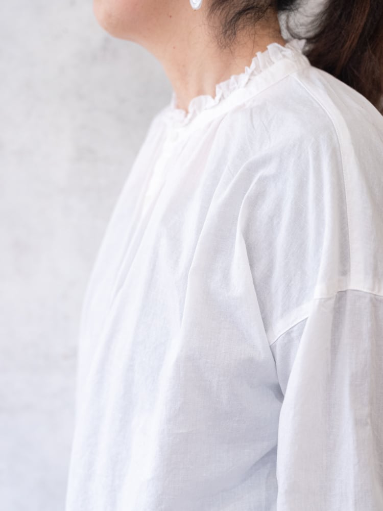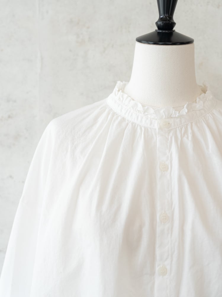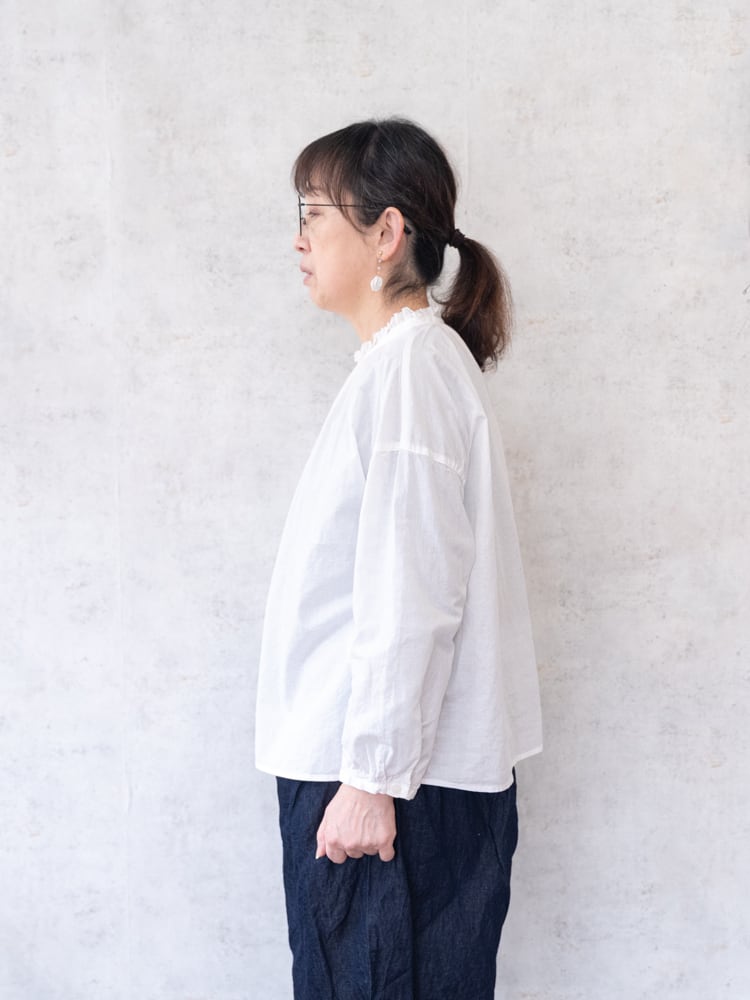 シンプルなデザインに切りっぱなしのフリル襟のデザインは重ね着にとても重宝するアイテムでフリルが顔周りを華やかに見せてくれます。