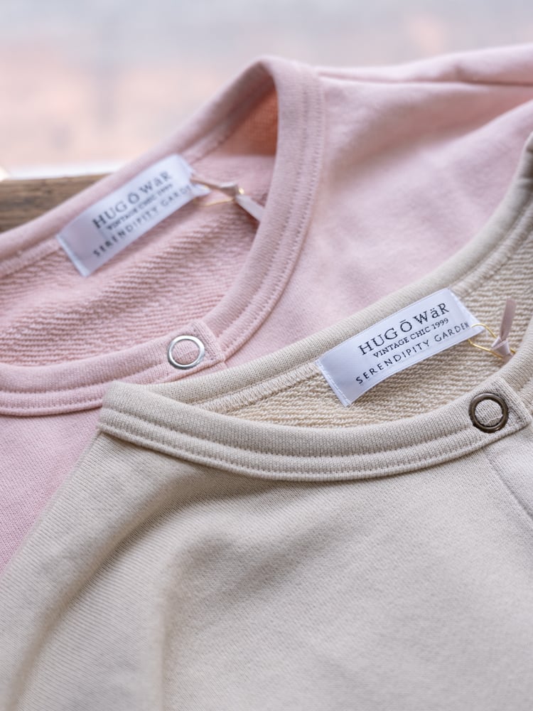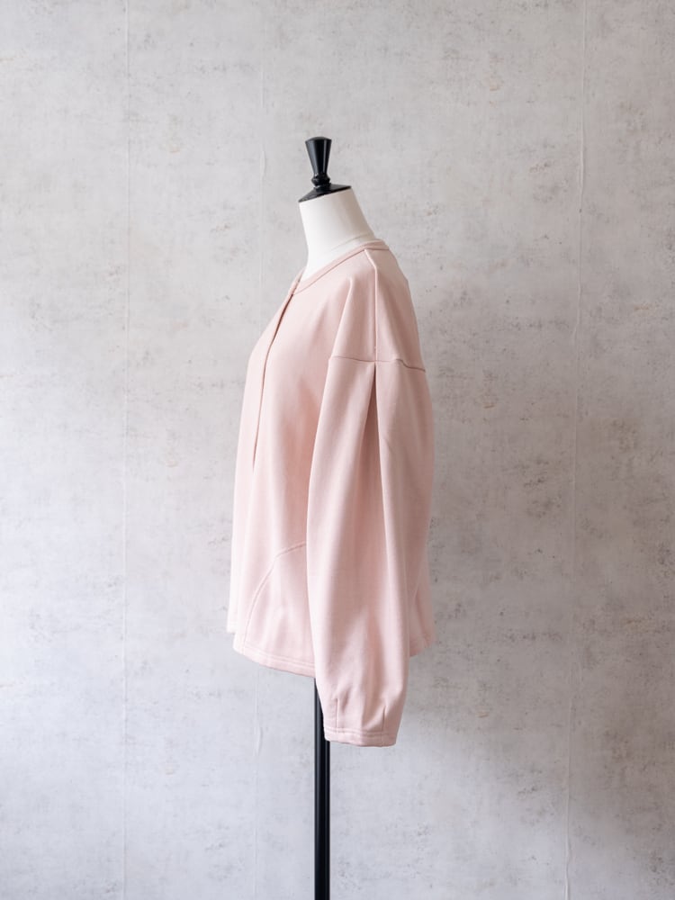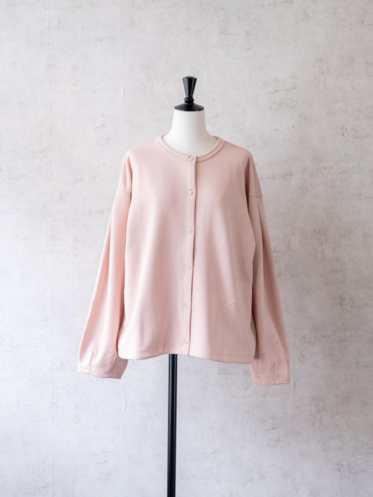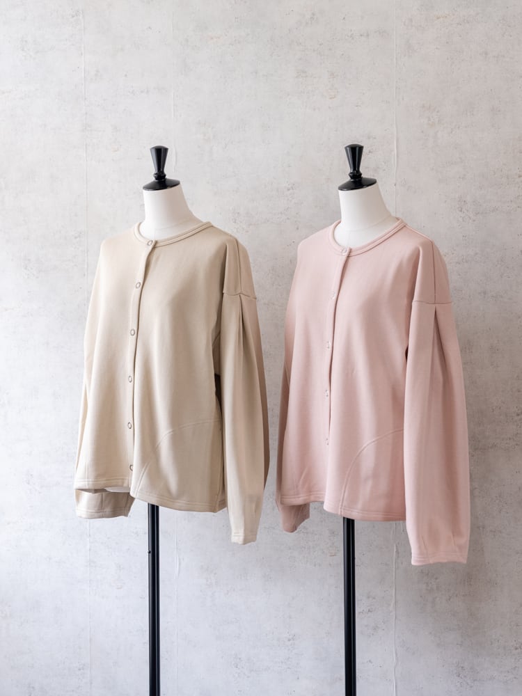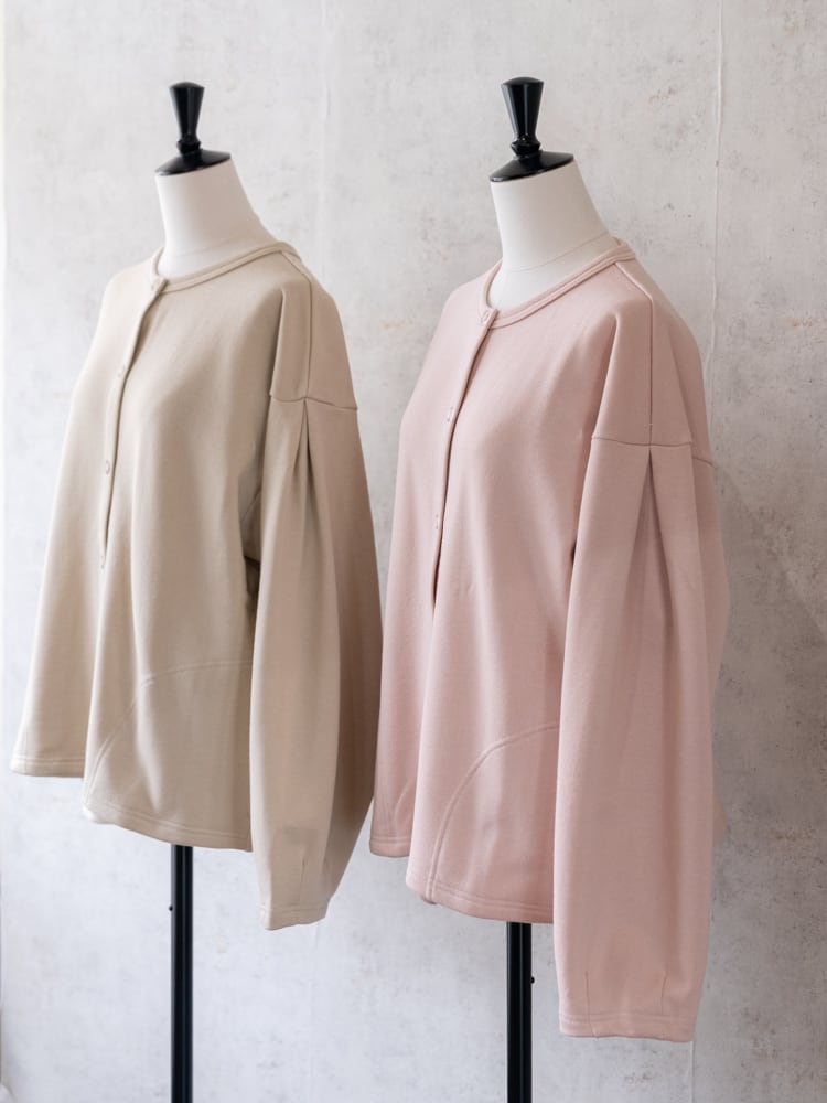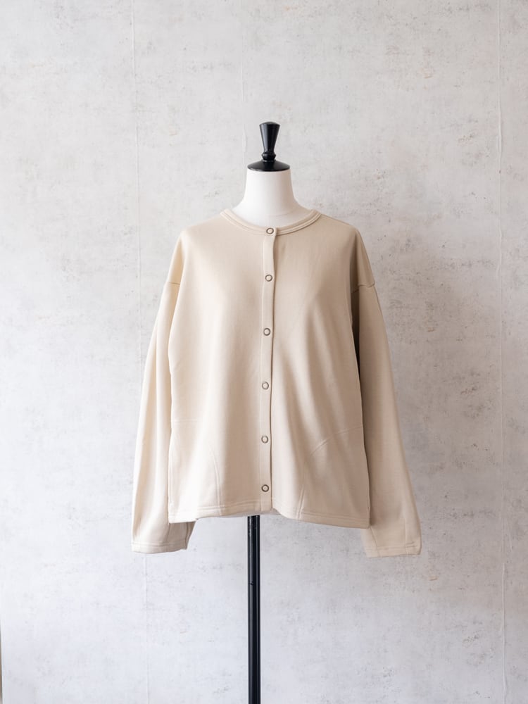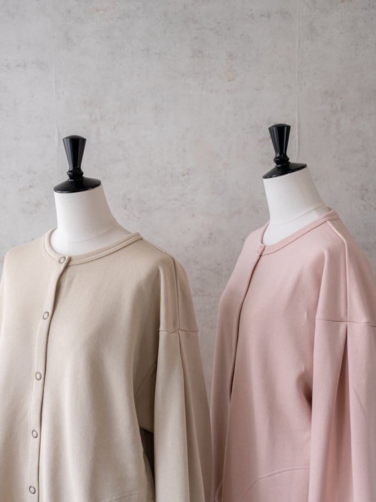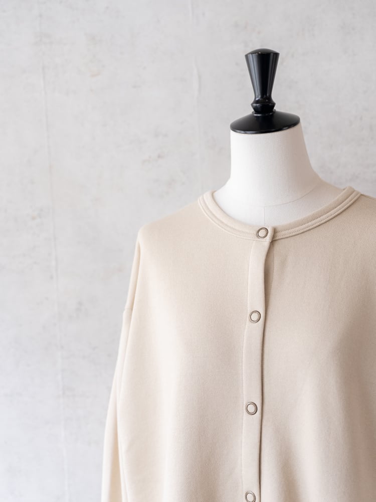 膨らみのある柔らかなスウェット素材を使用して、袖を通すたびにほっとする、ゆとりあるサイジングに仕上げました。一番のポイントは、フロントに並んだリングドットボタン。