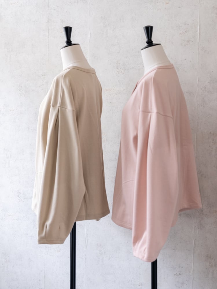 袖山と袖口に施したタックが、計算された立体的なシルエットを描き、カジュアルな素材でありながらどこかエレガントなニュアンスを醸し出します。