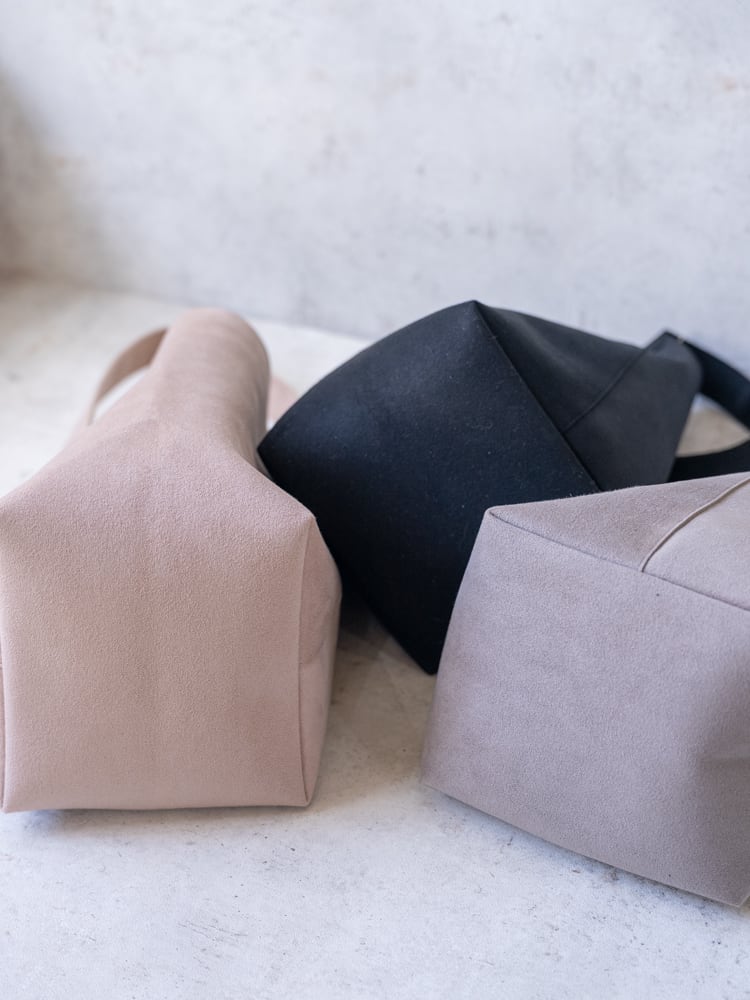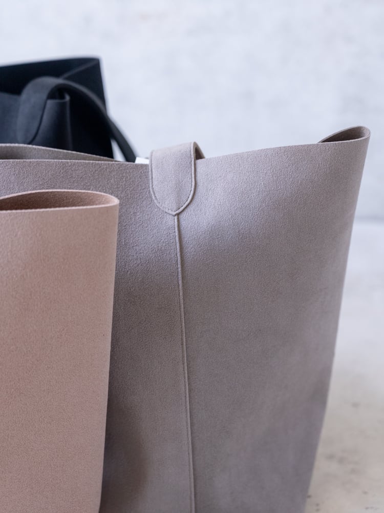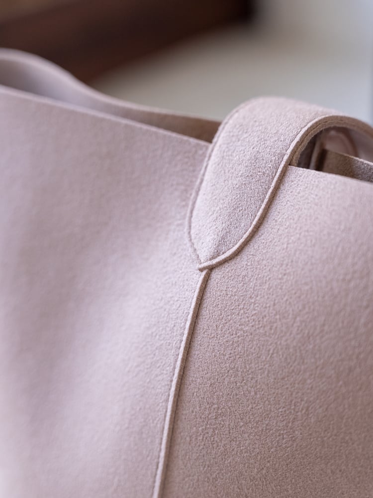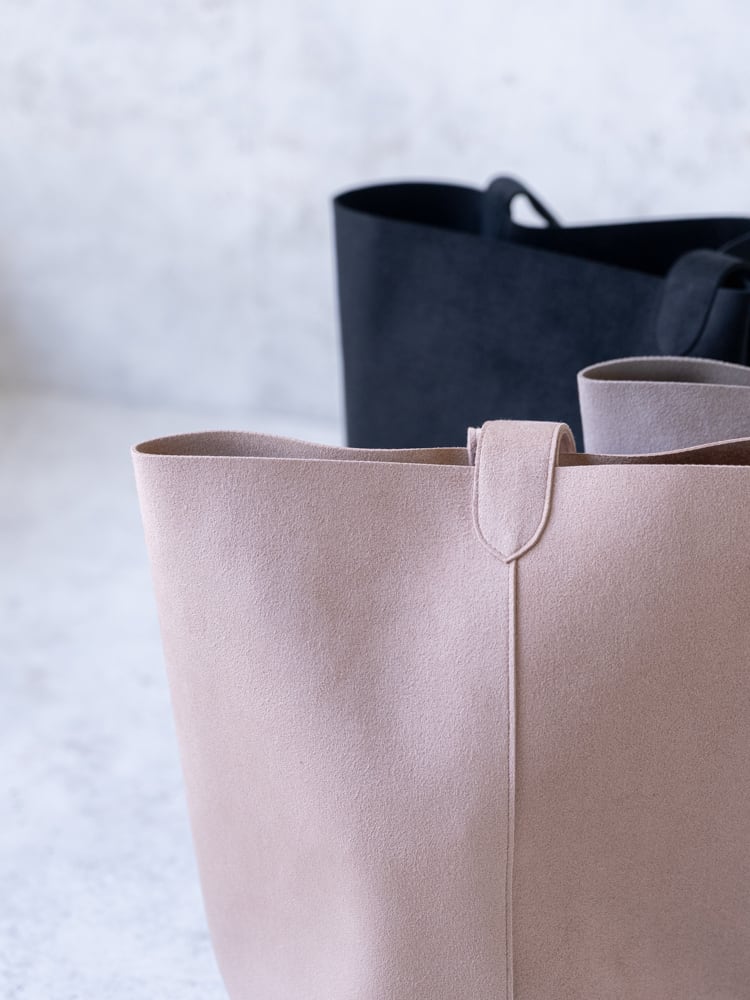 まるで本革のようななめらかな質感のウルトラスエードが描き出す凛としたシルエットのバケツ型のトートバッグ。