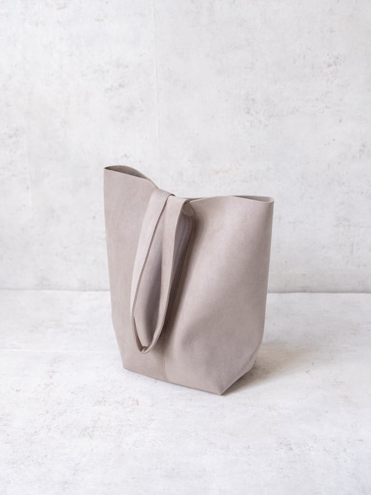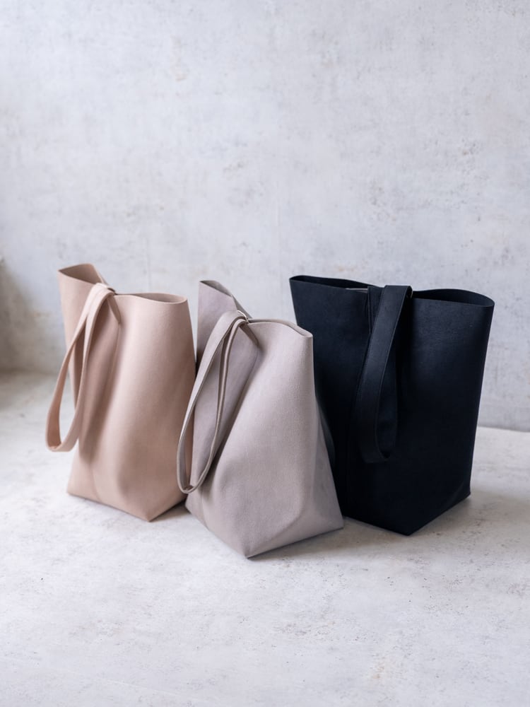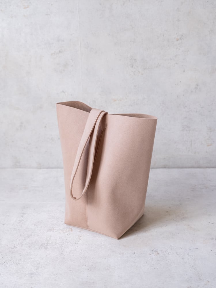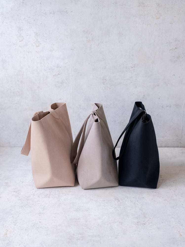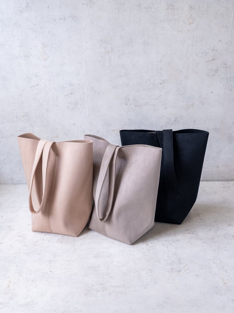 まるで本革のようななめらかな質感のウルトラスエードが描き出す凛としたシルエットのバケツ型のトートバッグ。