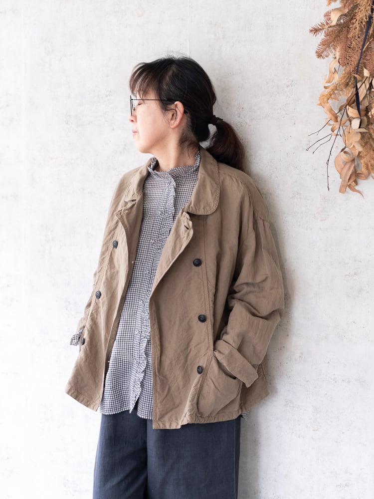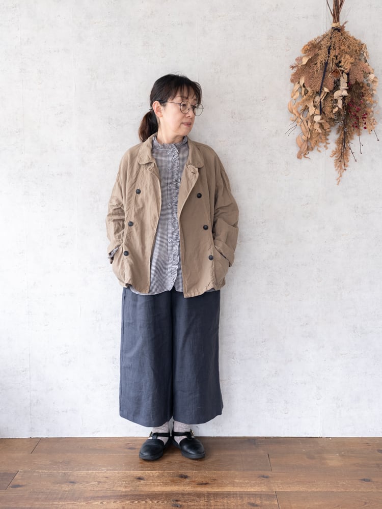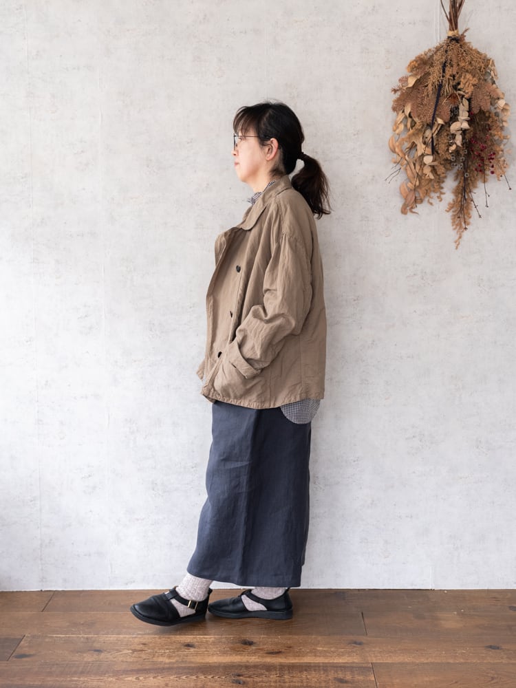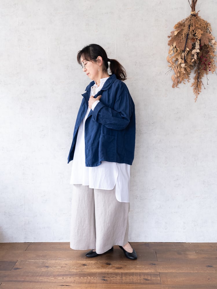リネン60%コットン40%の素材は薄手ながらややハリがある生地で、柔らかい風合いでさらっと羽織れる軽い着心地です。
