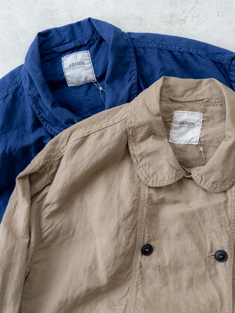 アーメンらしいワークウェアをベースにしながらもラウンドカラーにすることで無骨さを抑えた柔らかな印象のジャケット。