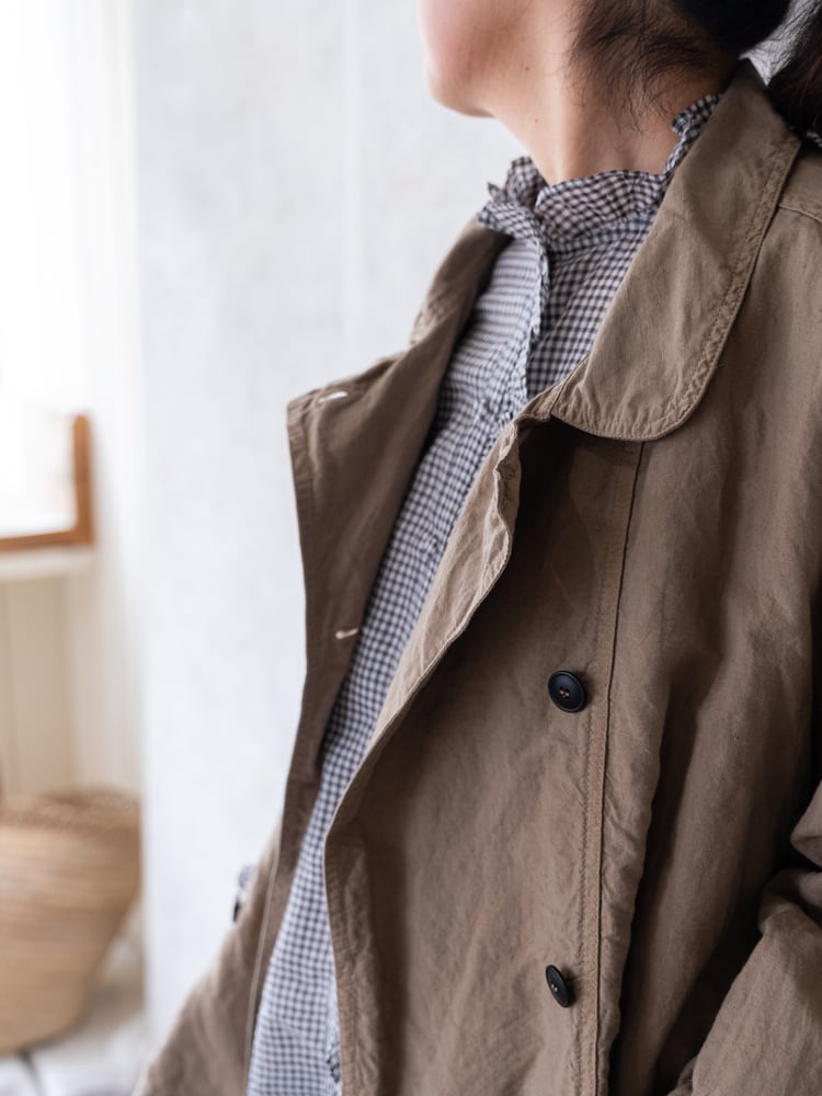 少し短めの着丈でボトムスとのバランスが取りやすく、スッキリとした丈感と羽織りやすいゆったりとしたサイジングを両立。ロングシーズン活躍する一着に仕上がっています。