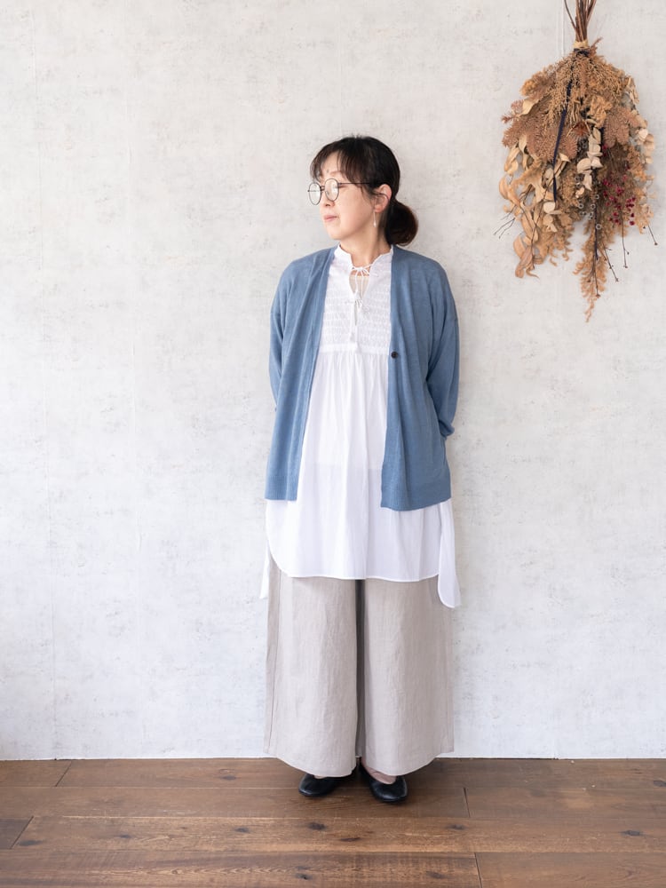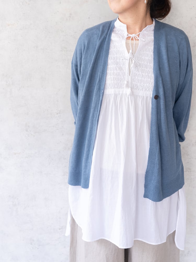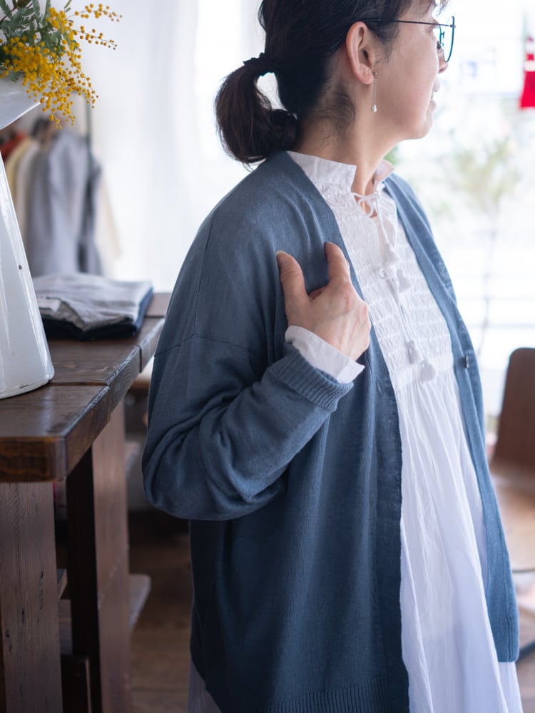 ソイル春夏シーズンの人気定番、サラッとした心地いい肌触りのリネンコットンニットのカーディガンです。