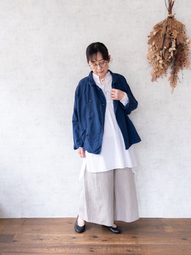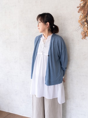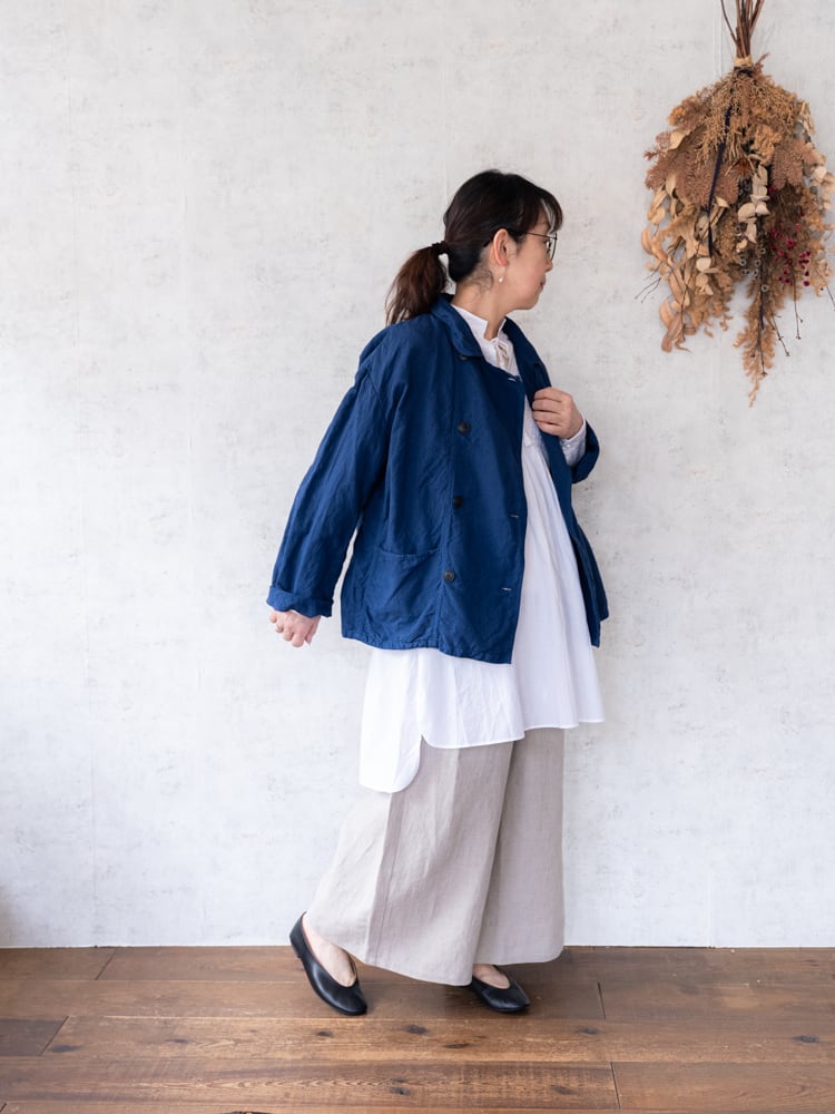 また、背中に施したギャザーが、ふんわりとしたシルエットを生み出し、女性らしい雰囲気に。胸元のタッセルは結ばずに垂らしておくだけでも程よいアクセントになってくれます。
