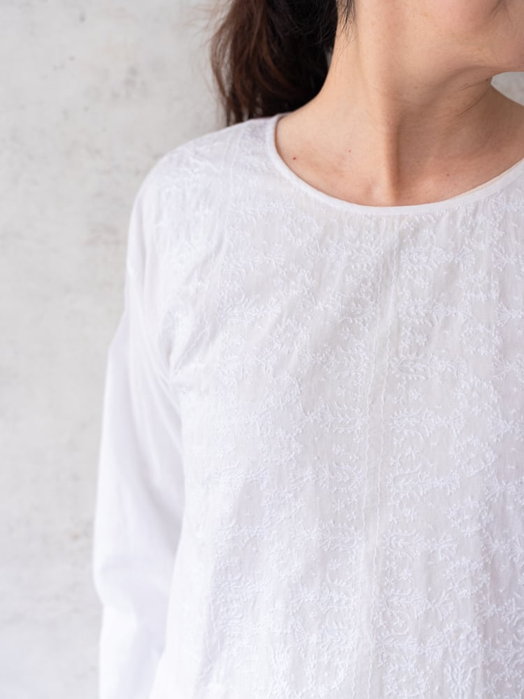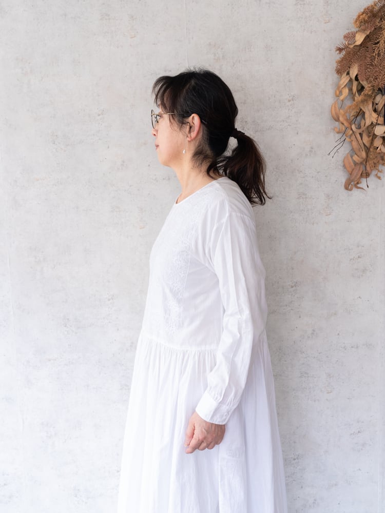 胸元に施された繊細な刺繍が静かな華やかさを醸し出すクルーネックドレス。主張しすぎない刺繍が見る人の目を引きつける密やかなアクセントとなっています。