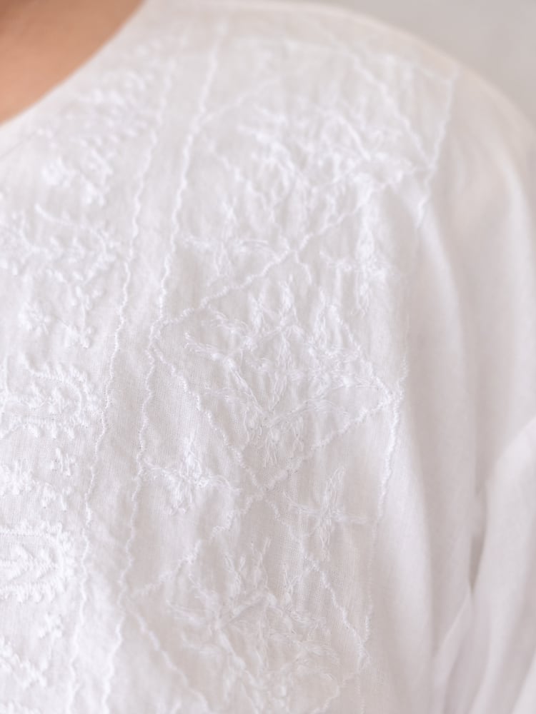 生地と同色の糸を使用した刺繍はコンピューターミシンではなく人の手で生地を動かしながら施されており職人の技術の高さと手仕事による温もりを感じる繊細かつ贅沢な一着に仕上がっています。