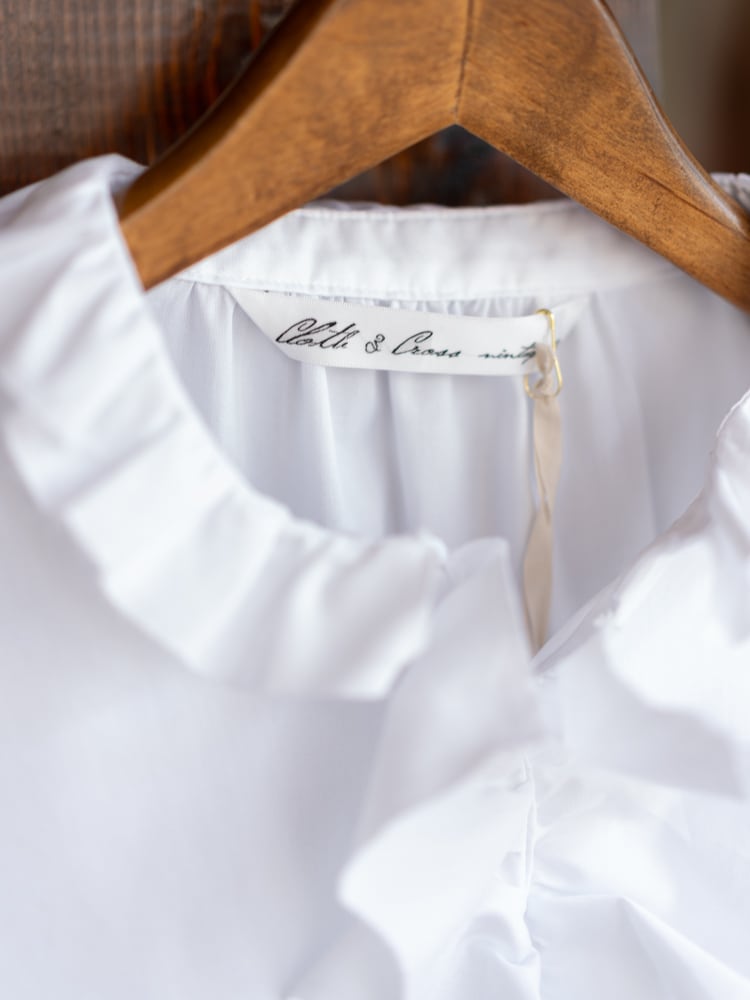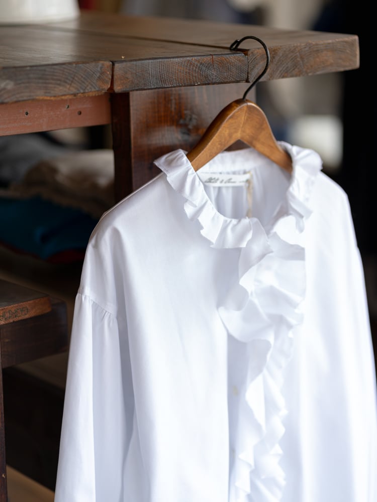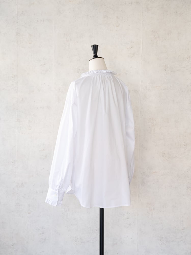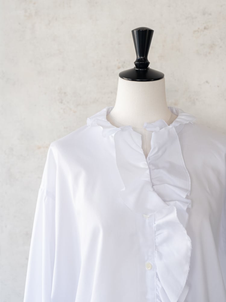 スペイン・バルセロナの老舗シャツ生地メーカー「SIDOGRAS(シドグラス)」のしなやかな生地で仕立てた、無地タイプのラッフルフリルシャツ。