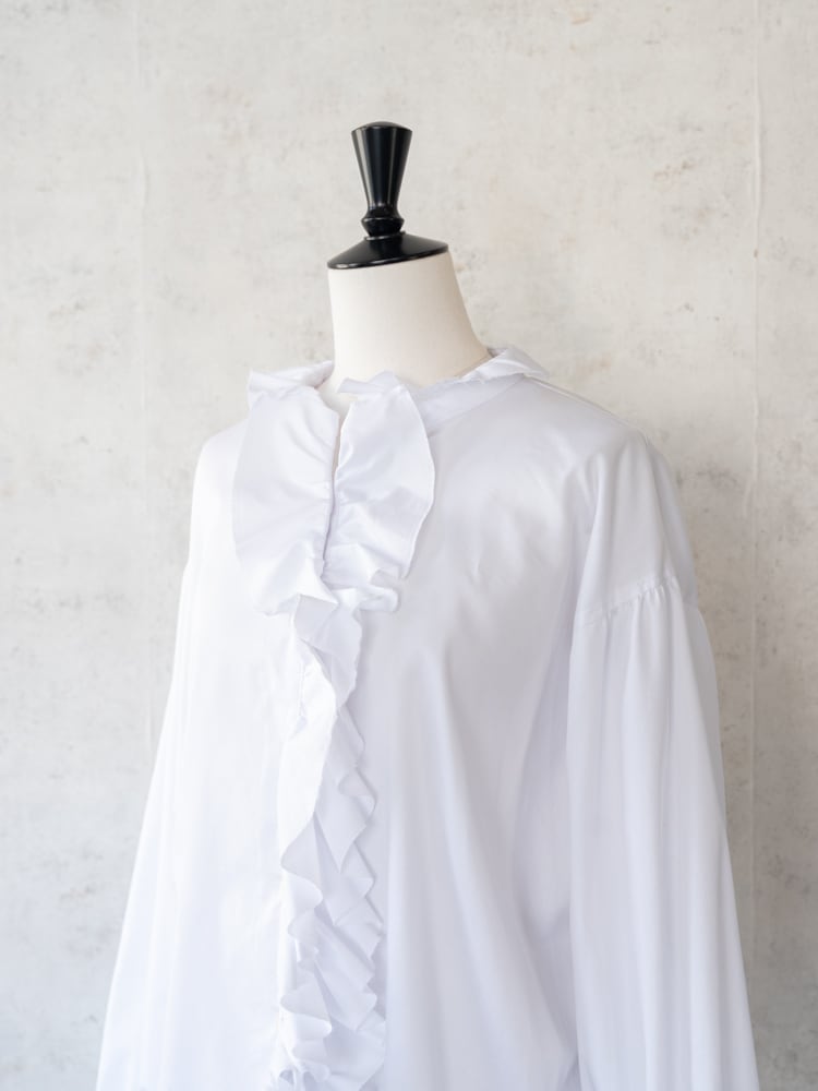 大胆にあしらったフロントのラッフルが目を惹き、シンプルに纏うだけで上品な華やぎを添える一枚です。