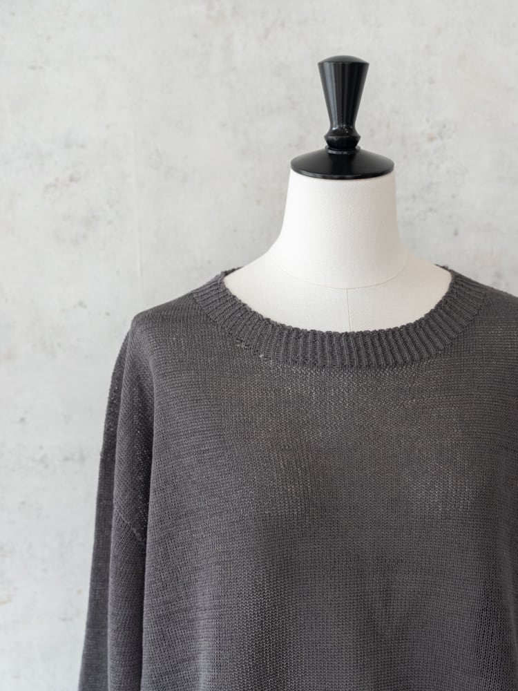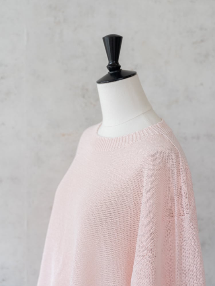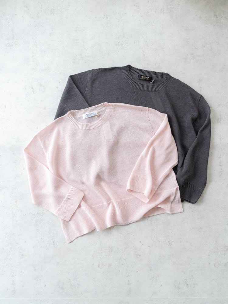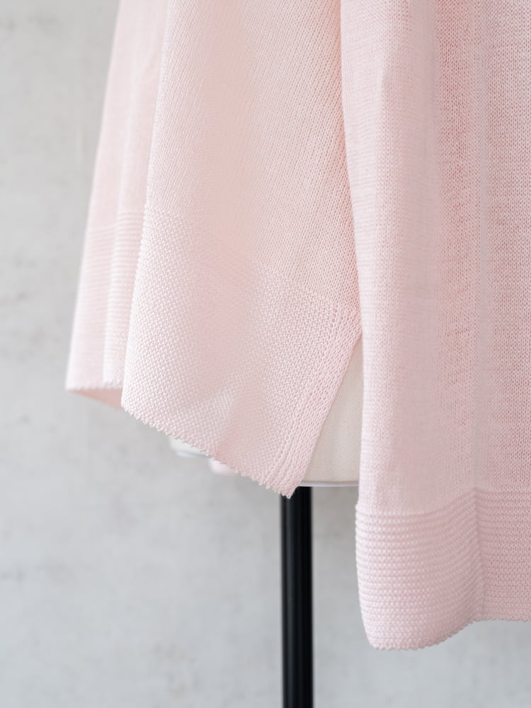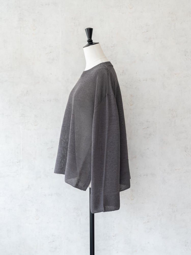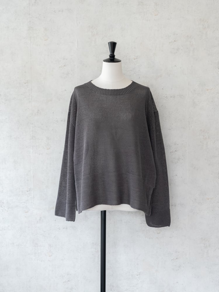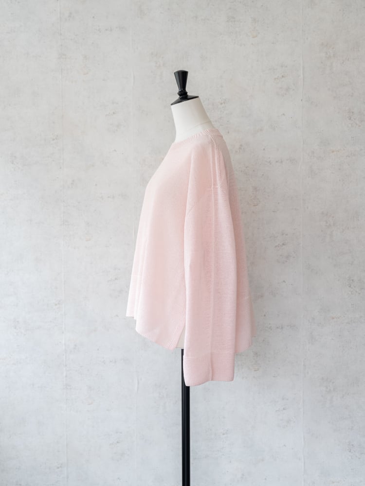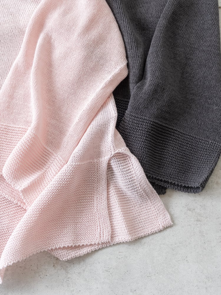 一見シンプルなデザインも、袖口と裾にガーター編みを配して表情のあるデザインに。ホールガーメント仕立てで肌あたりもよく、サイドスリットで抜け感をプラスした清涼感あるスプリングニットです。