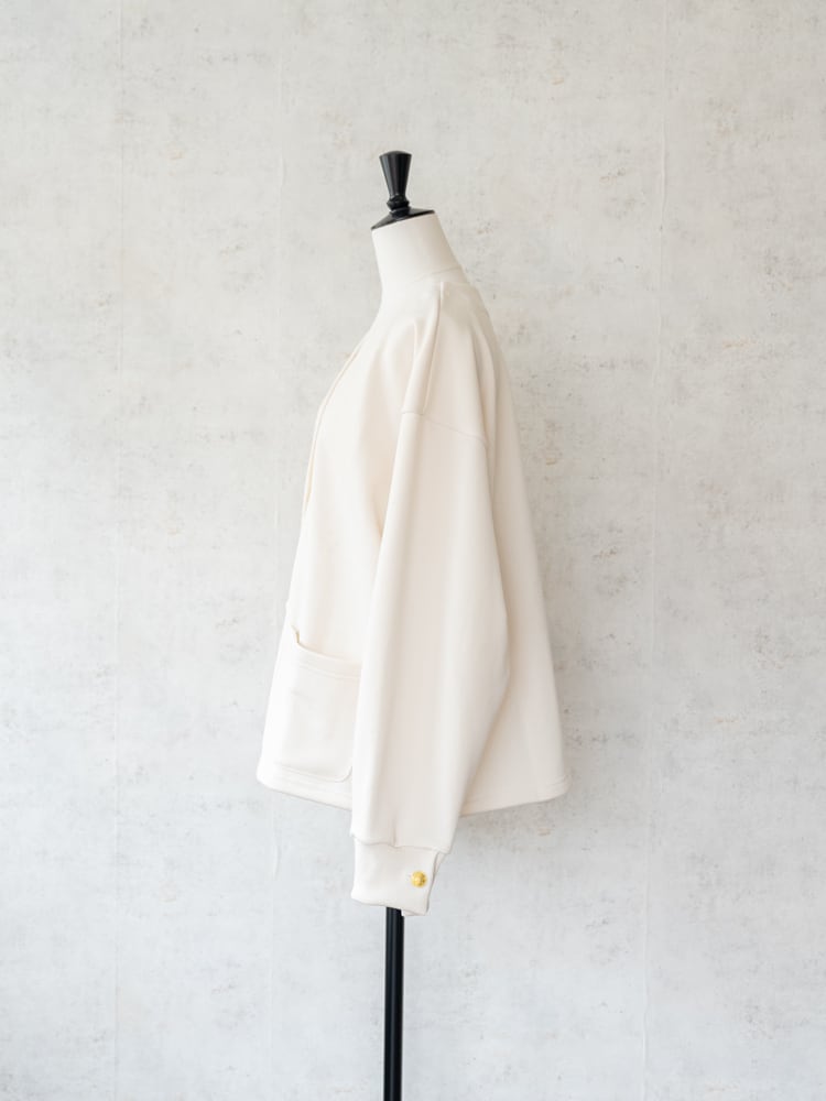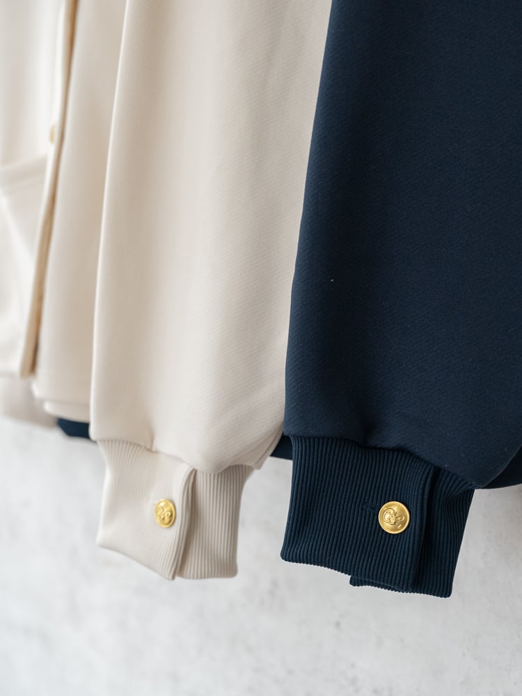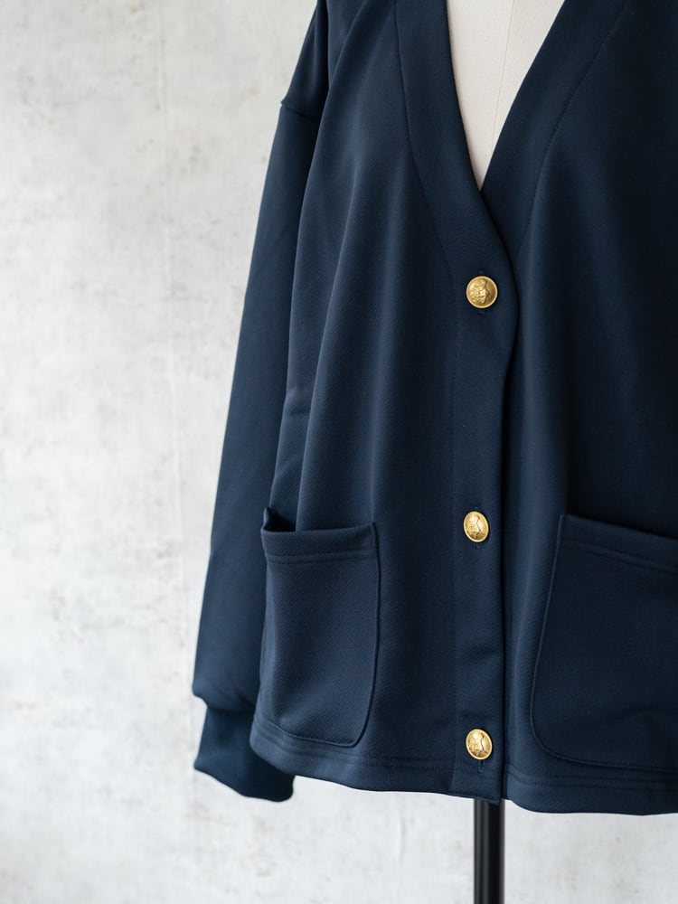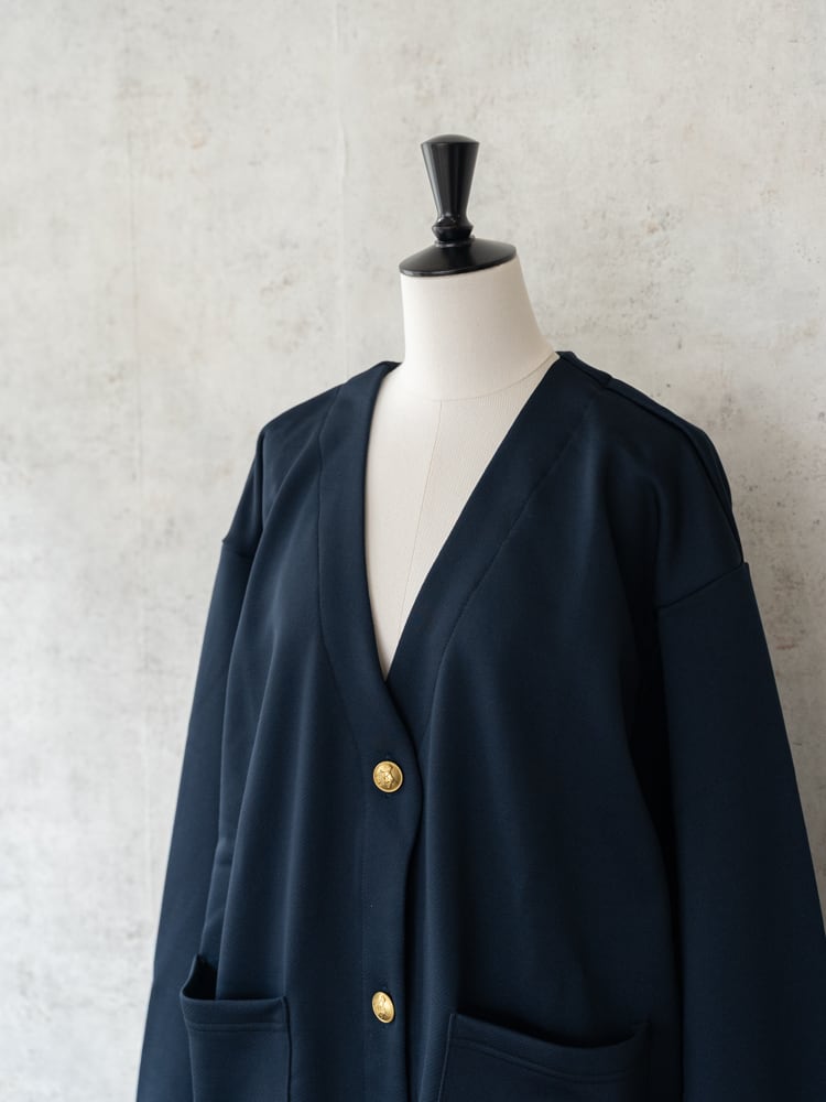 リラックス感のあるシルエットながら、深めのVネックや金ボタンの輝きが全体をキリリと引き締めます。