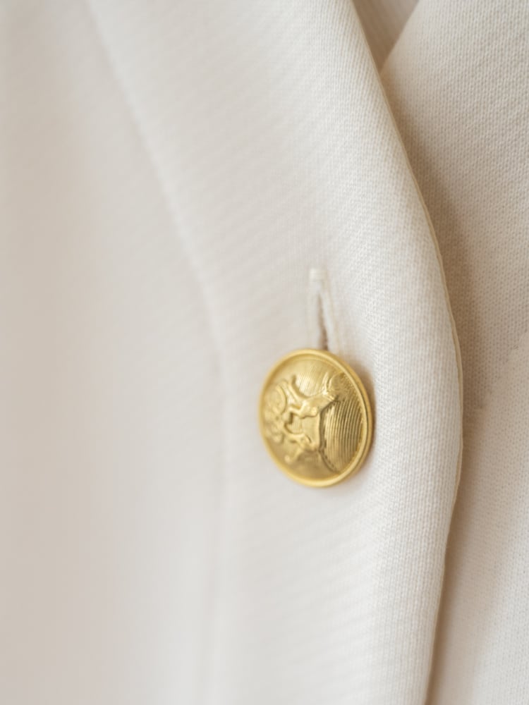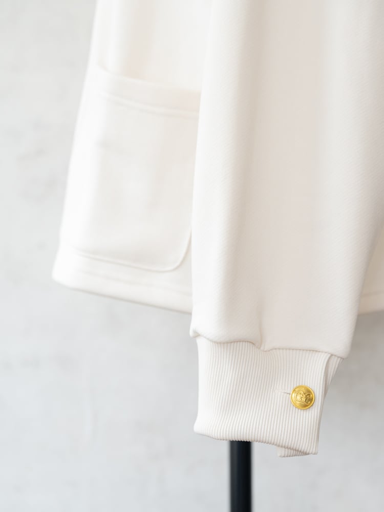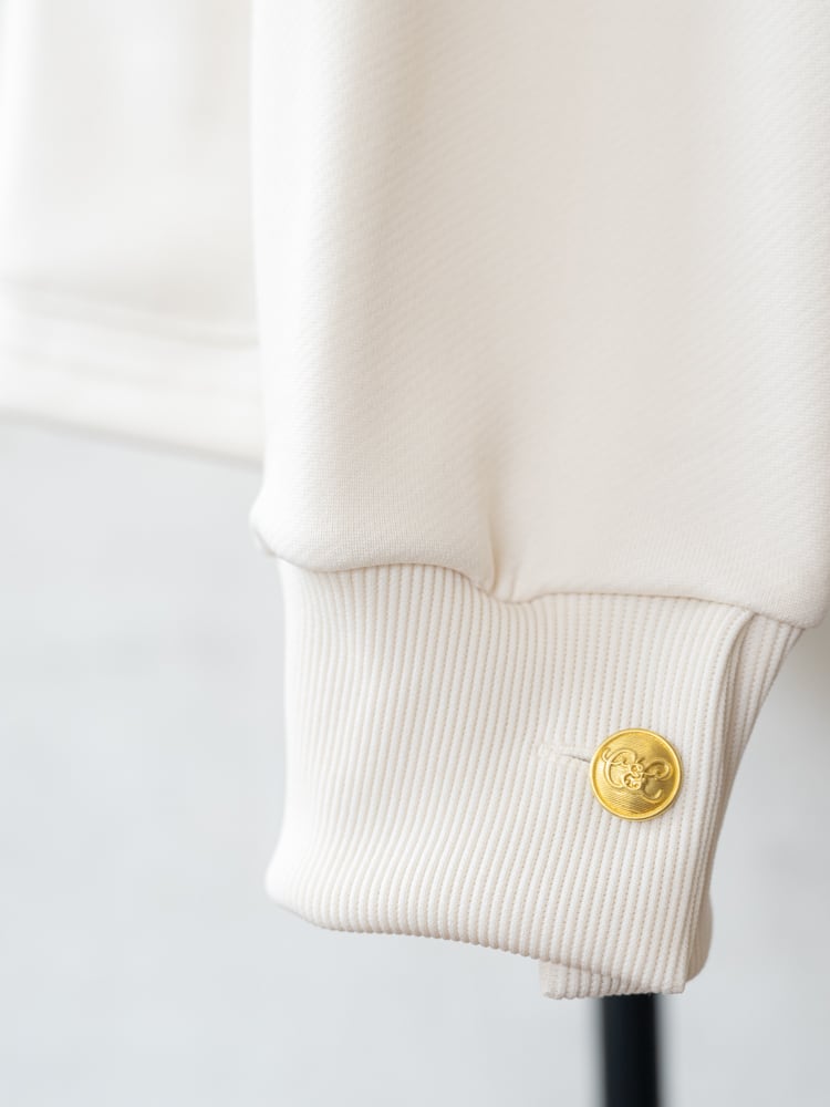 一番のこだわりは、職人が型から起こした贅沢な真鍮ボタン。フロントにはデザイナー雅姫の愛犬"ヴォルス"を、リブでリズムをつけた袖口には、ブランドイニシャル"C&C"の刻印を。