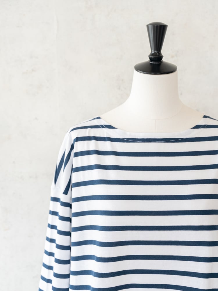 インナーとしても最適なやわらかな肌触りで、上品なボートネックがすっきりとしたデコルテラインを演出。程よいゆとりとドロップショルダーのデザインが、着るだけでコーディネートに抜け感を与えてくれます。