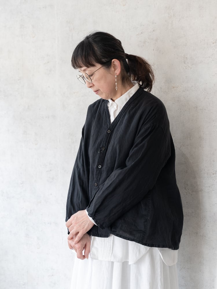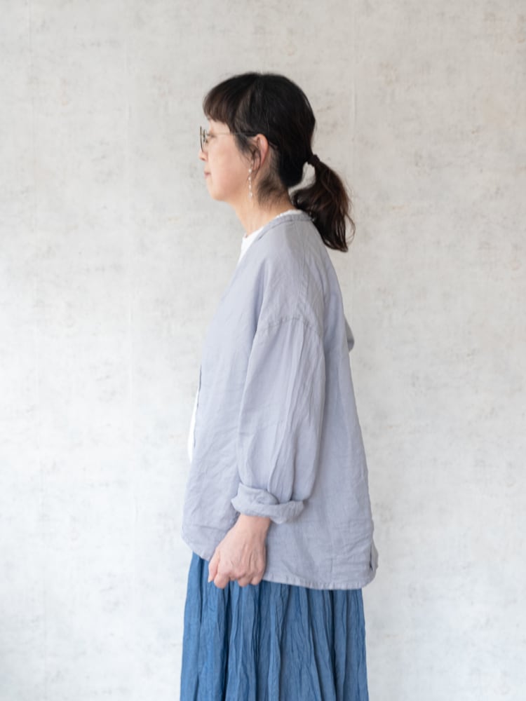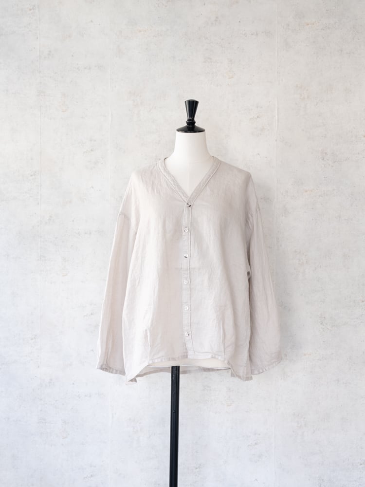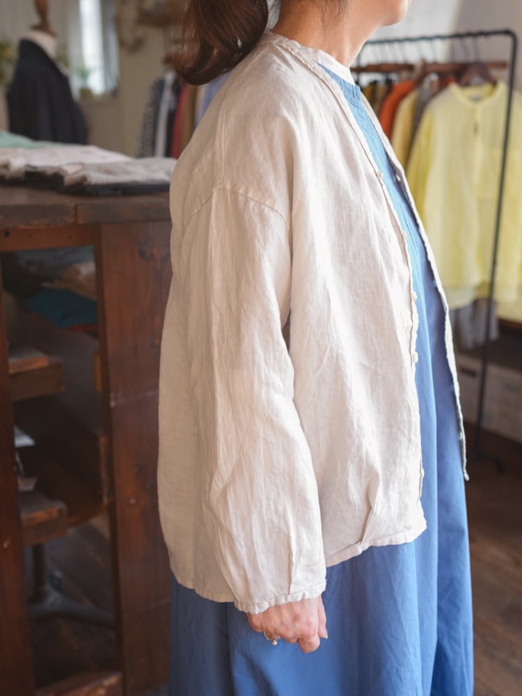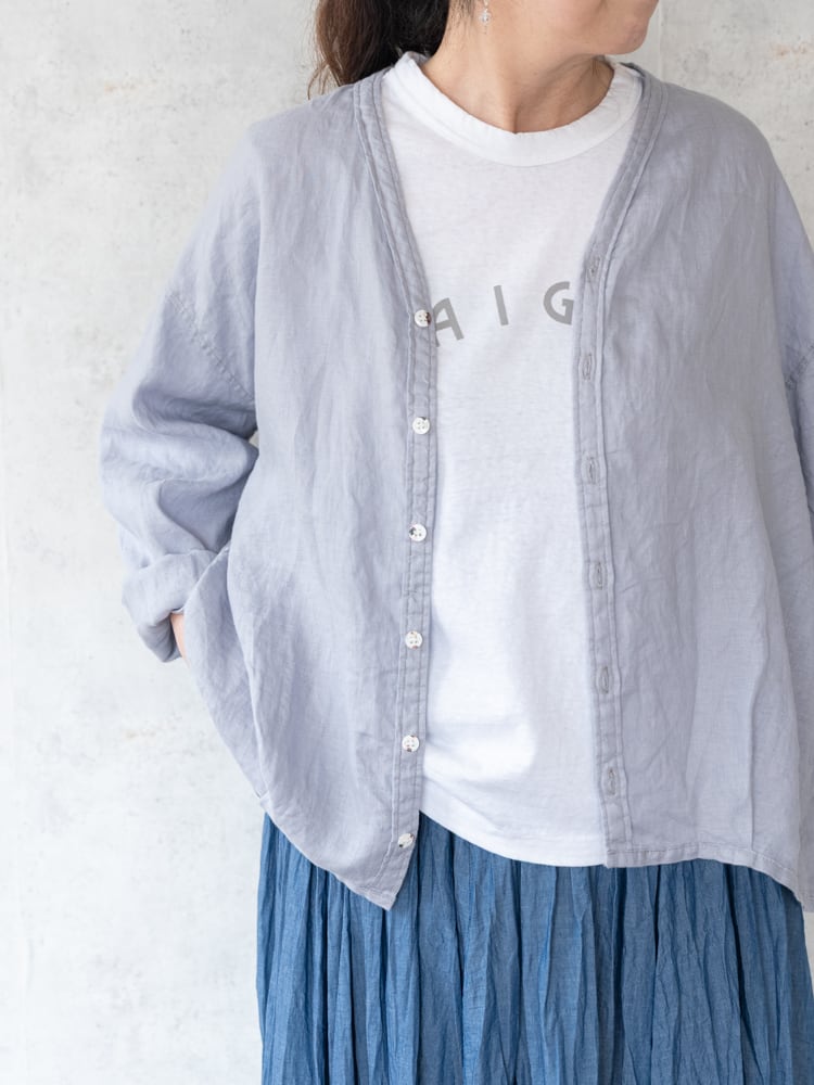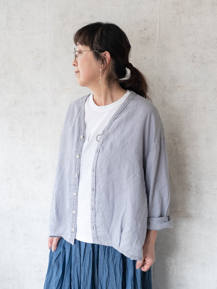 カーディガンのデザインをそのままシャツ生地に落とし込んだブロカントの人気定番、カルディガンシャツのリネン素材を使った春夏タイプ。
