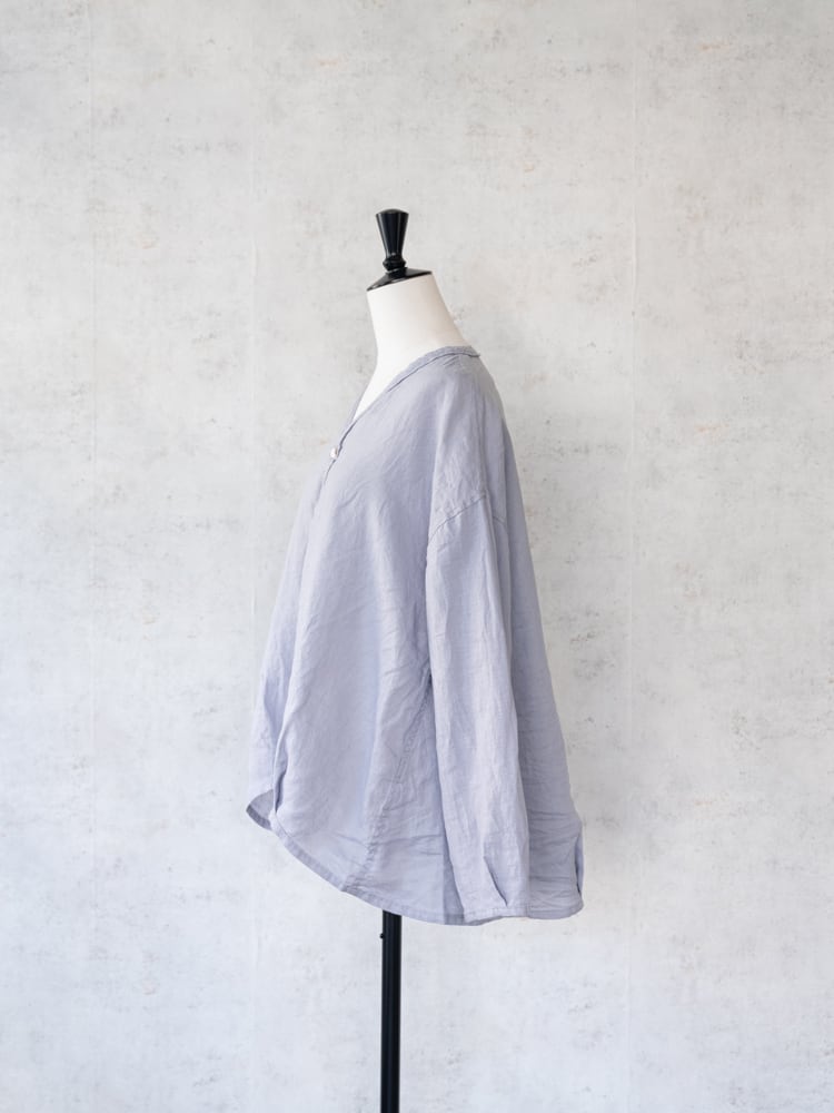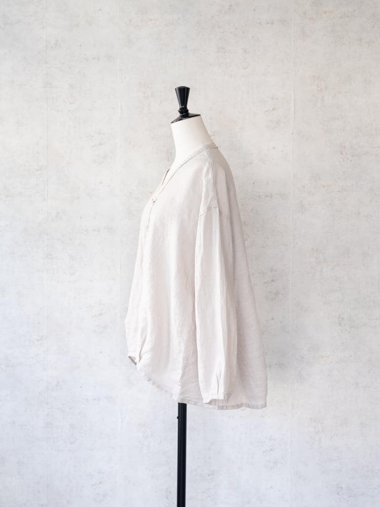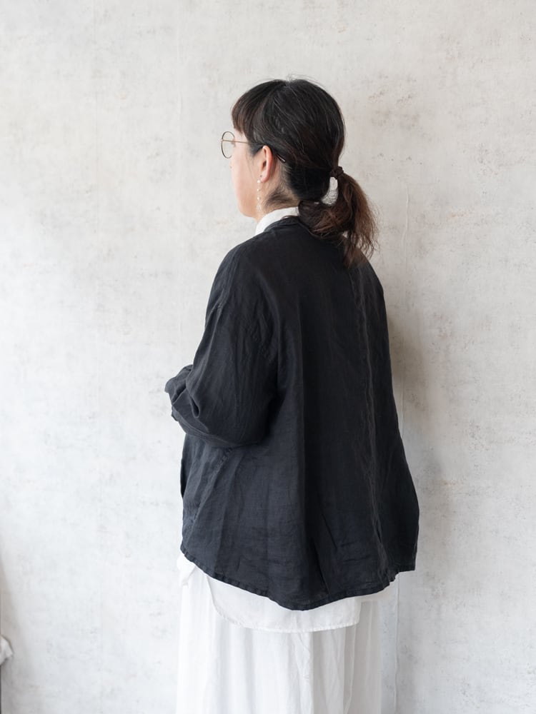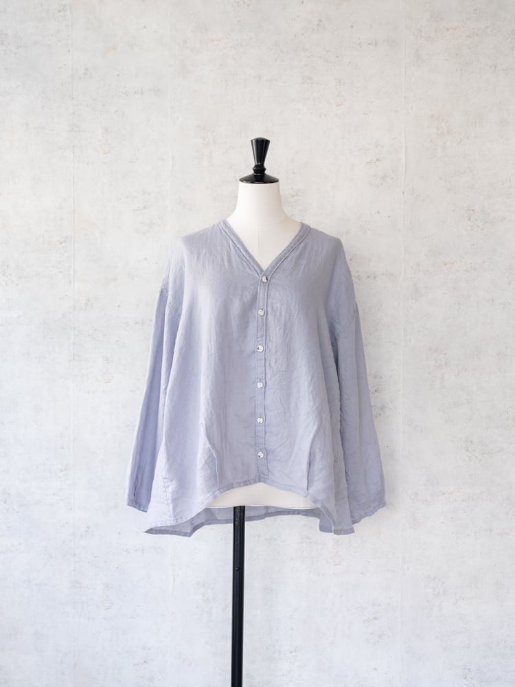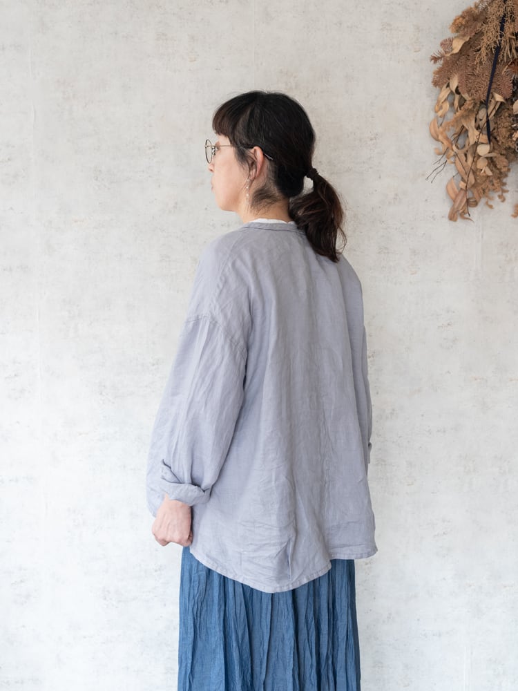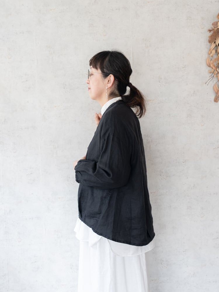 カーディガンのデザインをそのままシャツ生地に落とし込んだブロカントの人気定番、カルディガンシャツのリネン素材を使った春夏タイプ。