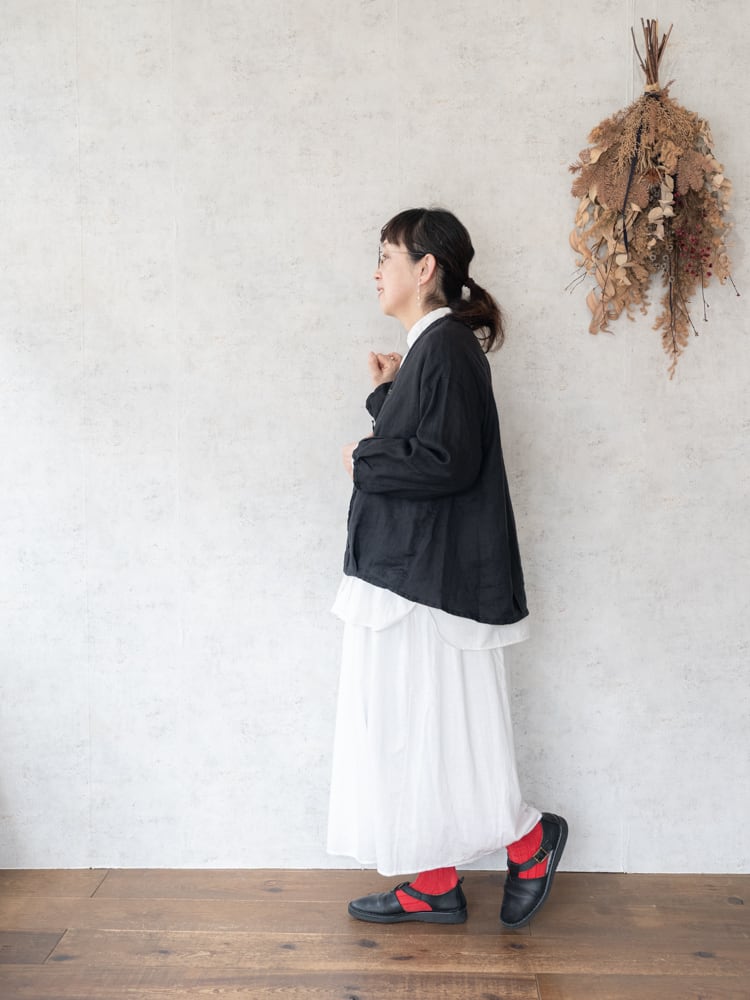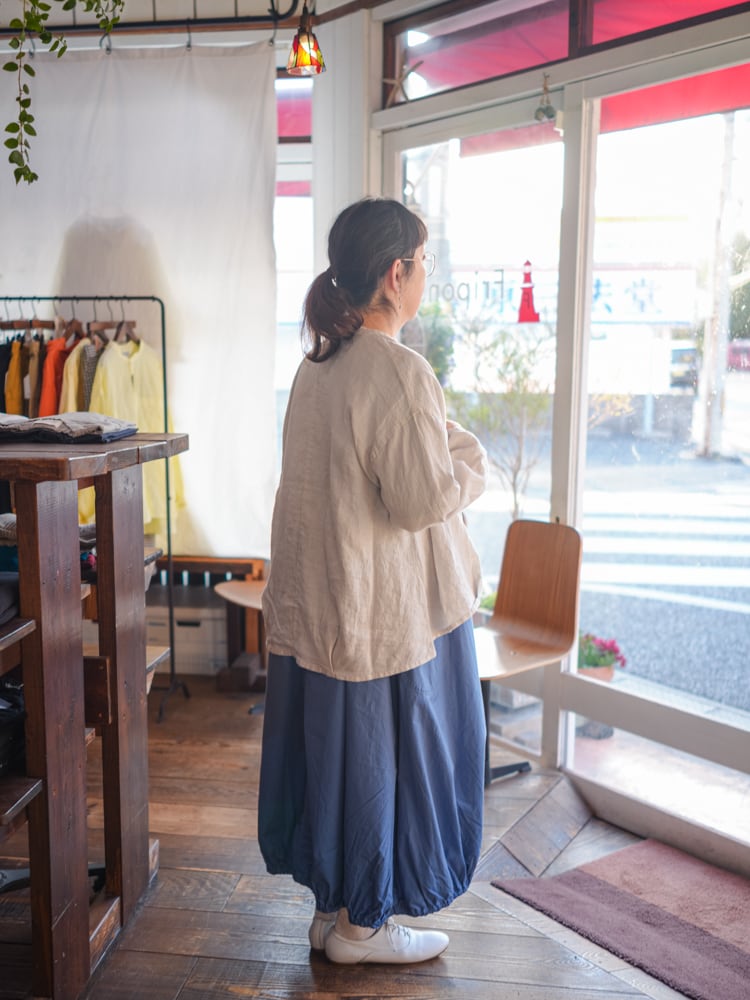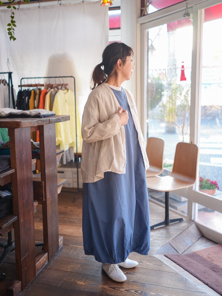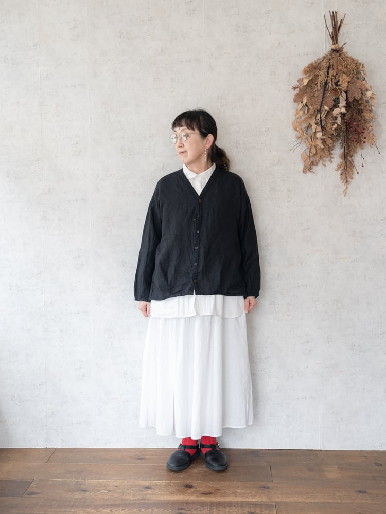 甘すぎずカジュアルすぎずどんなテイストのスタイルにも合わせやすく、くったりとしたリネン素材がボリューム感を主張しすぎず、ふわっと風に揺れるような軽さで夏場の冷房除けにも活躍しそうです。