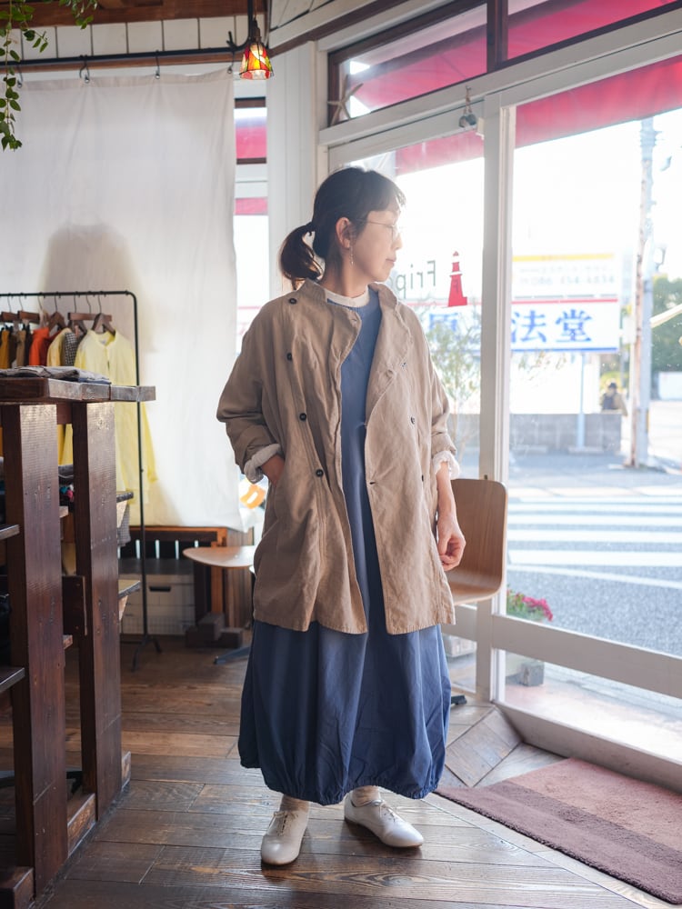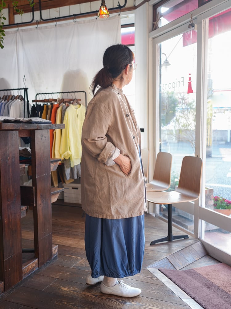 コットンリネンをブレンドした生地は綿の柔らかな肌なじみと、リネン特有の清涼感あるドライな質感を兼ね備えています。製品染めならではの独特な色ムラやパッカリングが、本格的なワークテイストを感じさせ、着込むほどに増していく風合いも魅力のひとつです。
