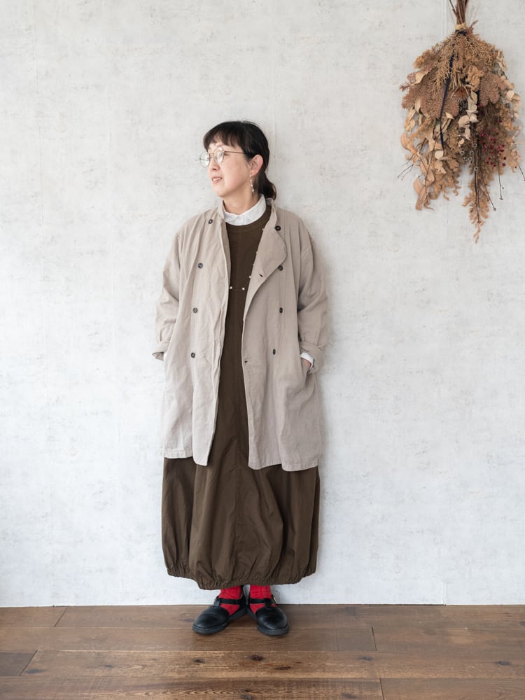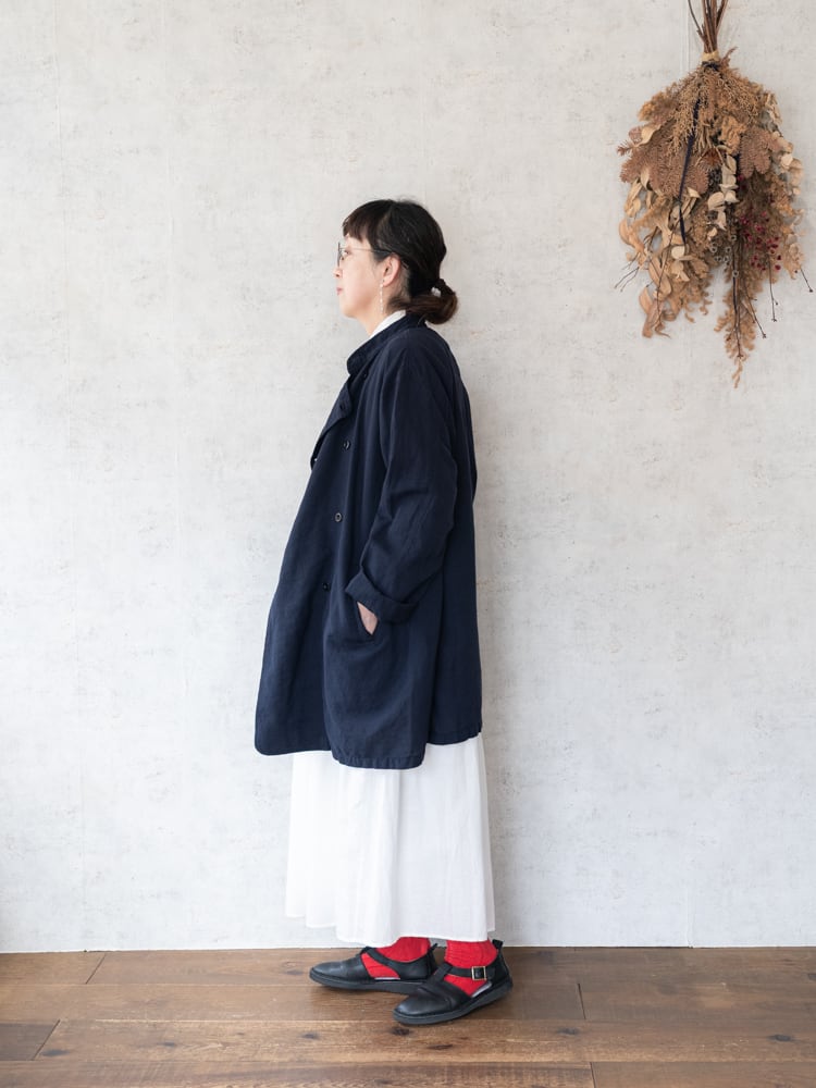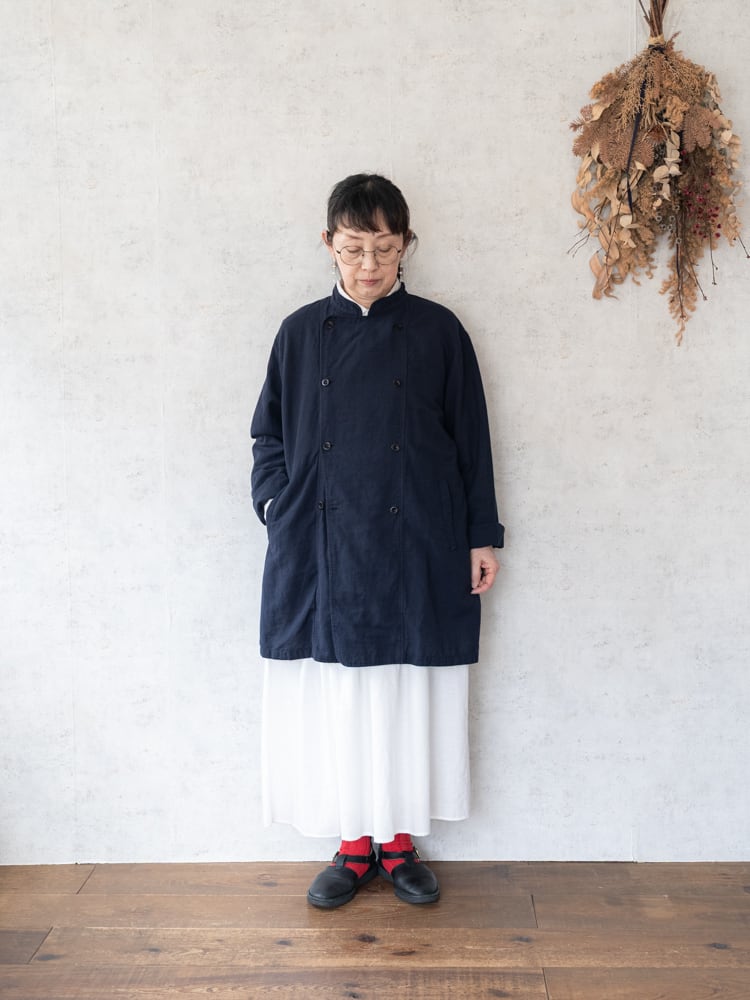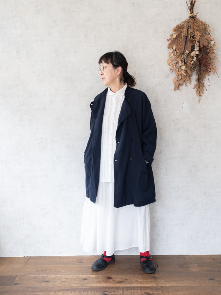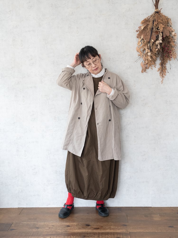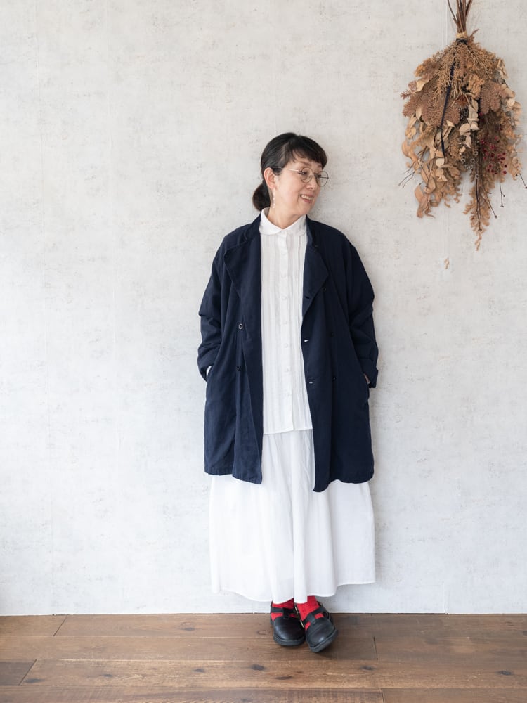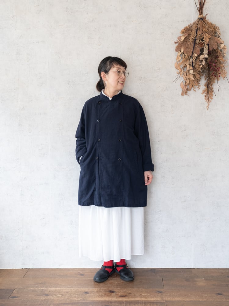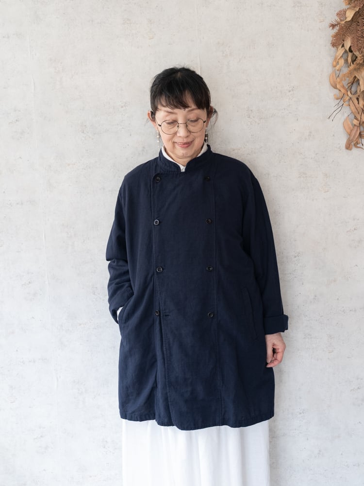 首元をスッキリと見せるスタンドカラーに、腰回りが隠れる長めの着丈、クラシックなダブルブレストを組み合わせた、存在感のある一着です。ボタンを開けてラフに羽織れば、ダブル特有の重なりが美しいドレープを生み、こなれた「抜け感」を演出します。
