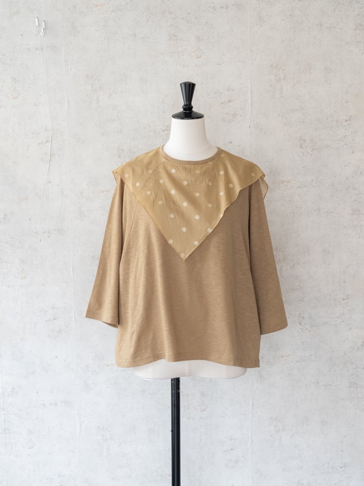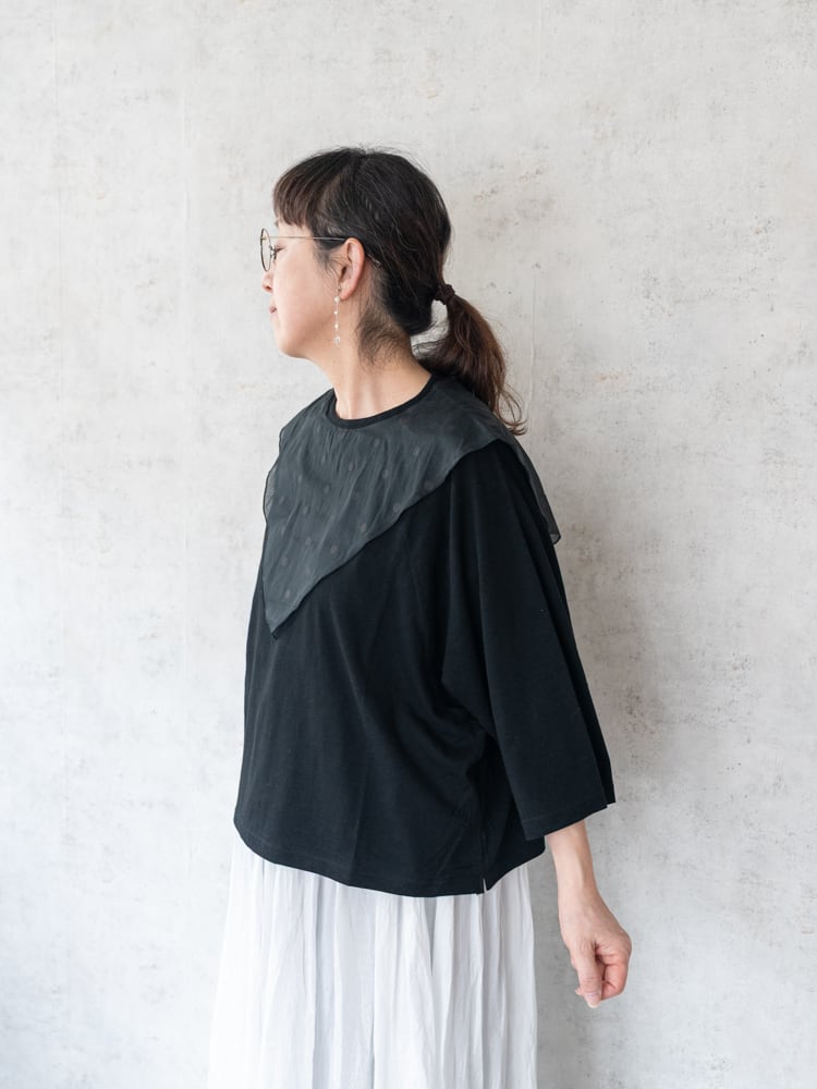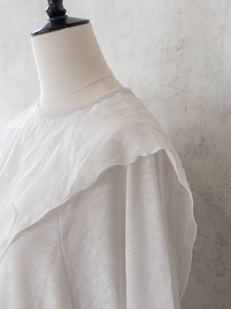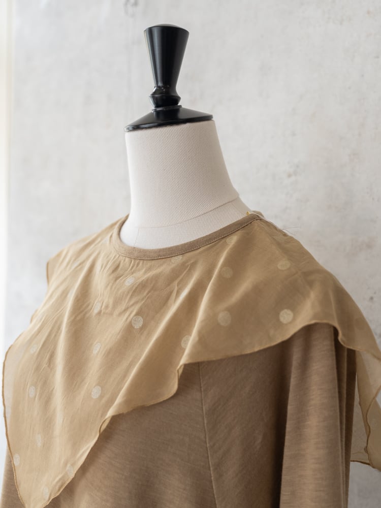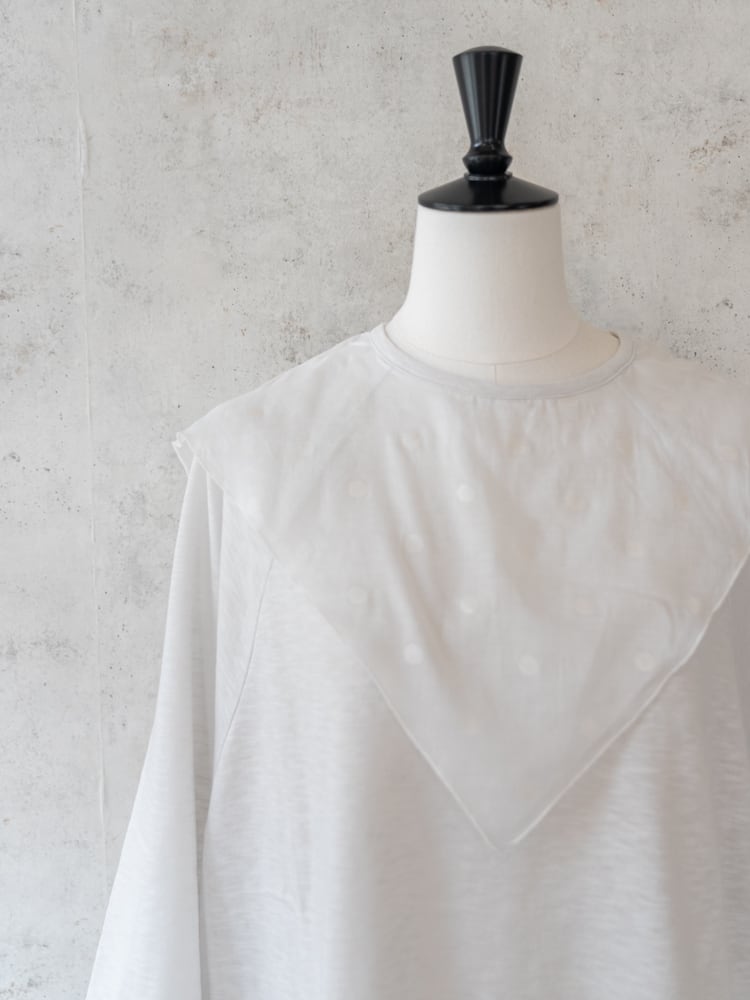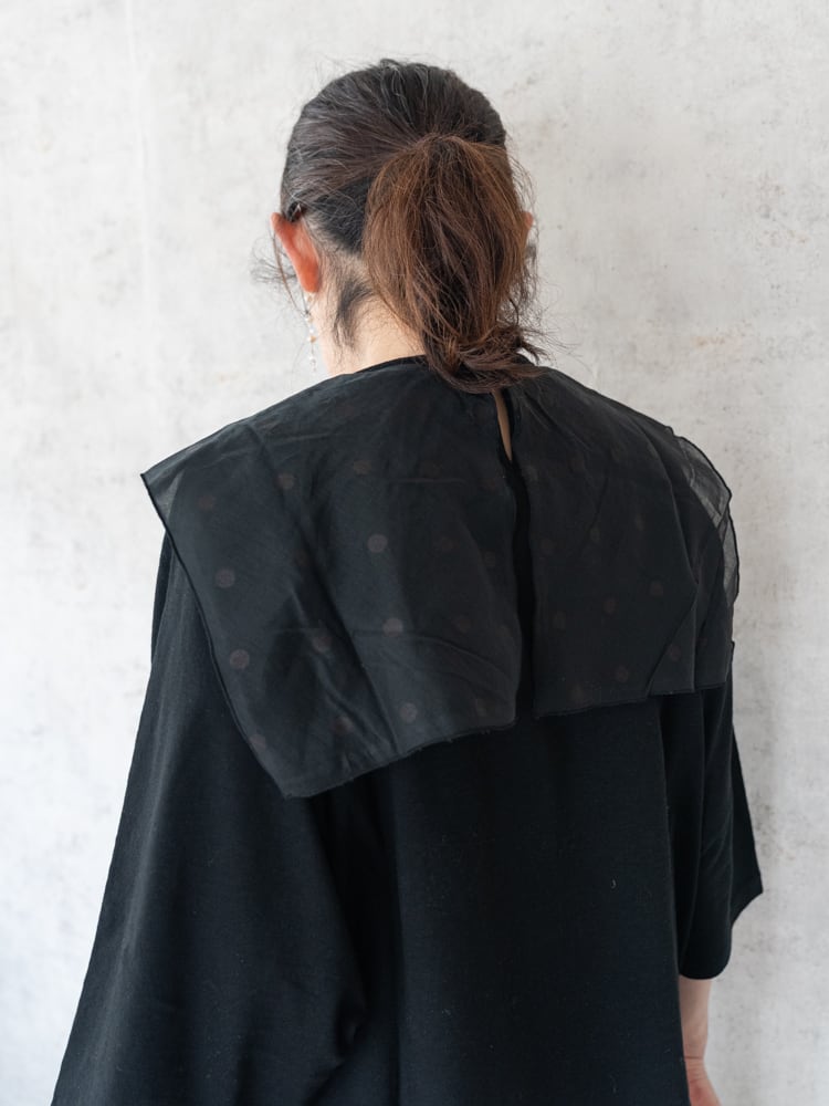 合わせたドット柄のスカーフのオーガンジーのような素材感が儚げで優しい大人な女性らしい雰囲気を演出。カラーによってドットの見え方に違いがあり好みに合わせたセレクトが楽しめます。