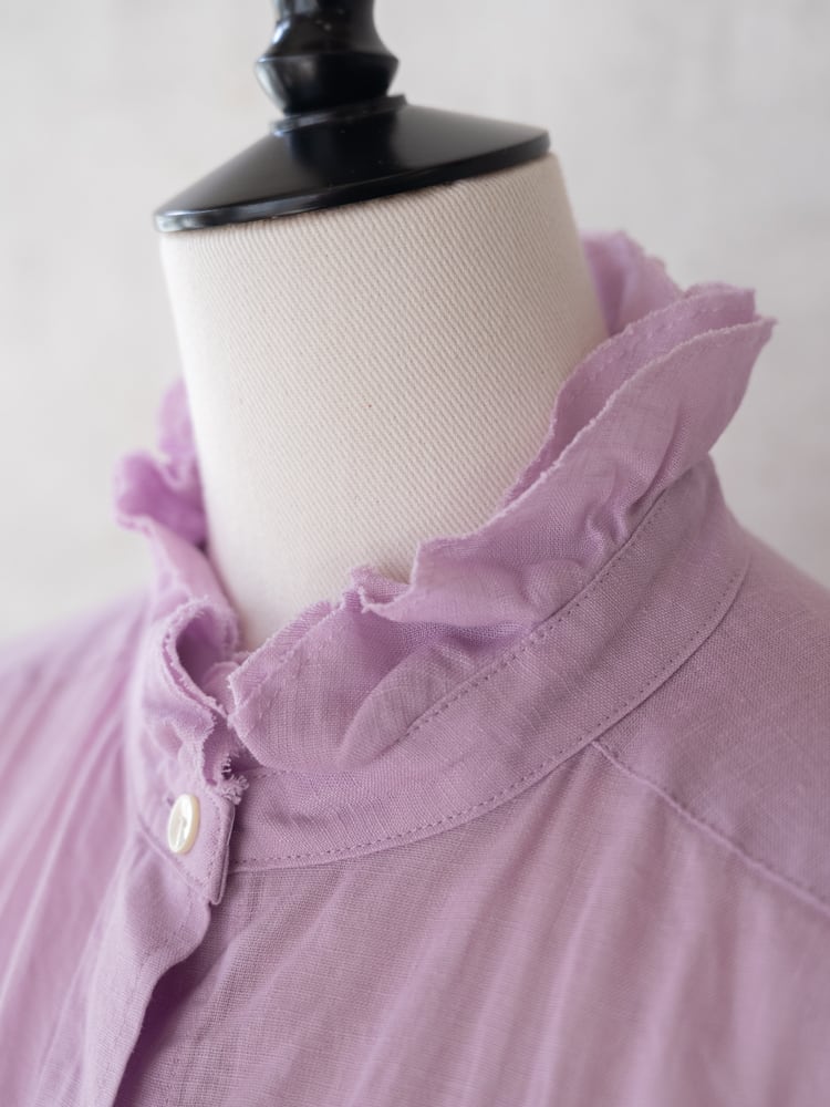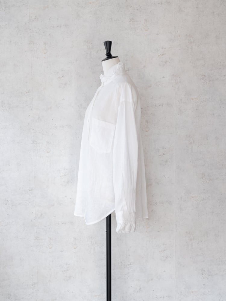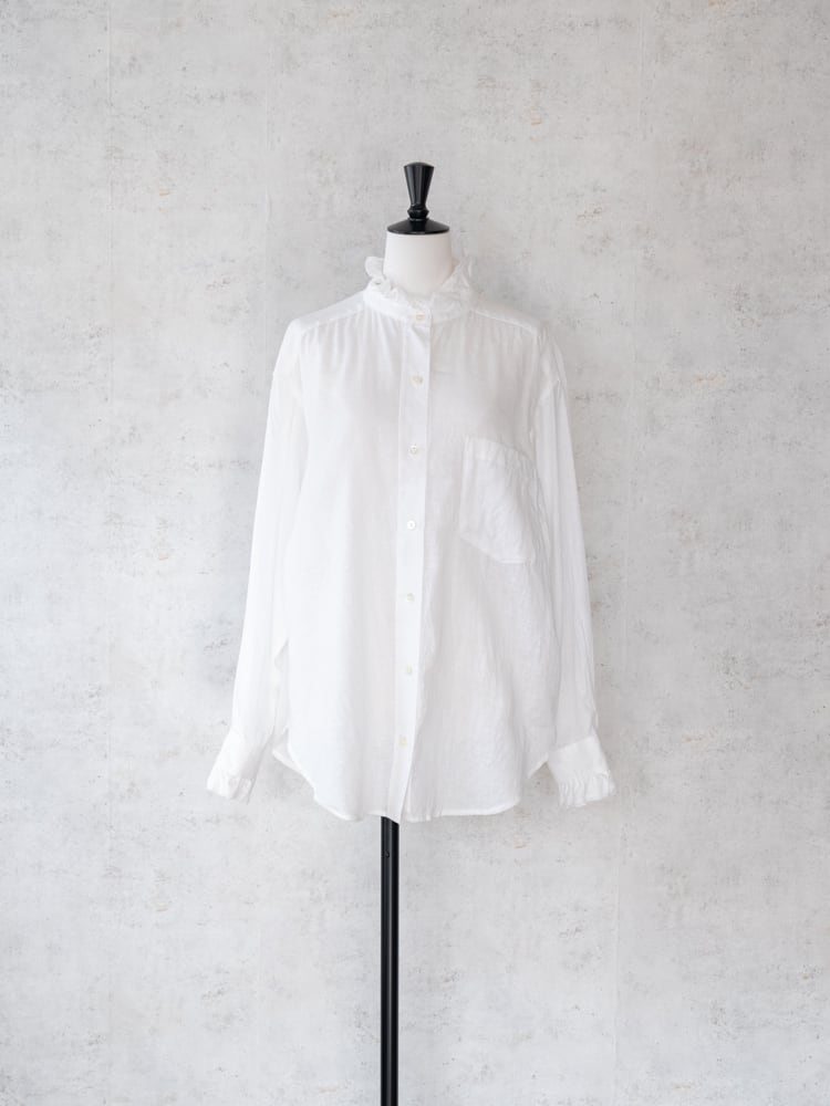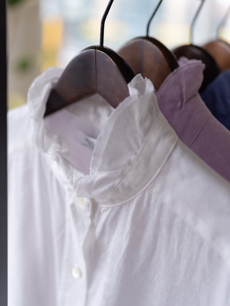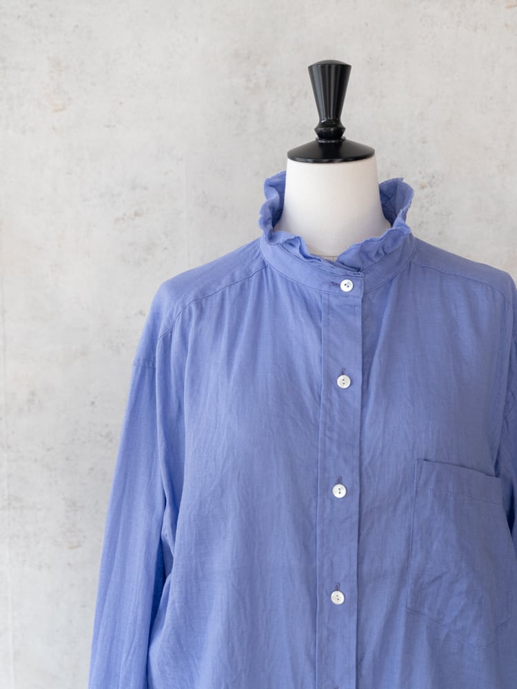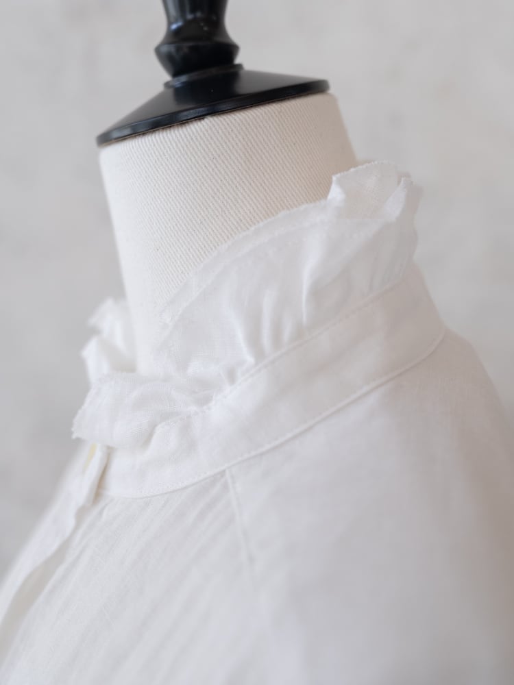 清涼感あふれるリネンコットンの生地で仕立てた、フリルカラーのスタンドシャツ。