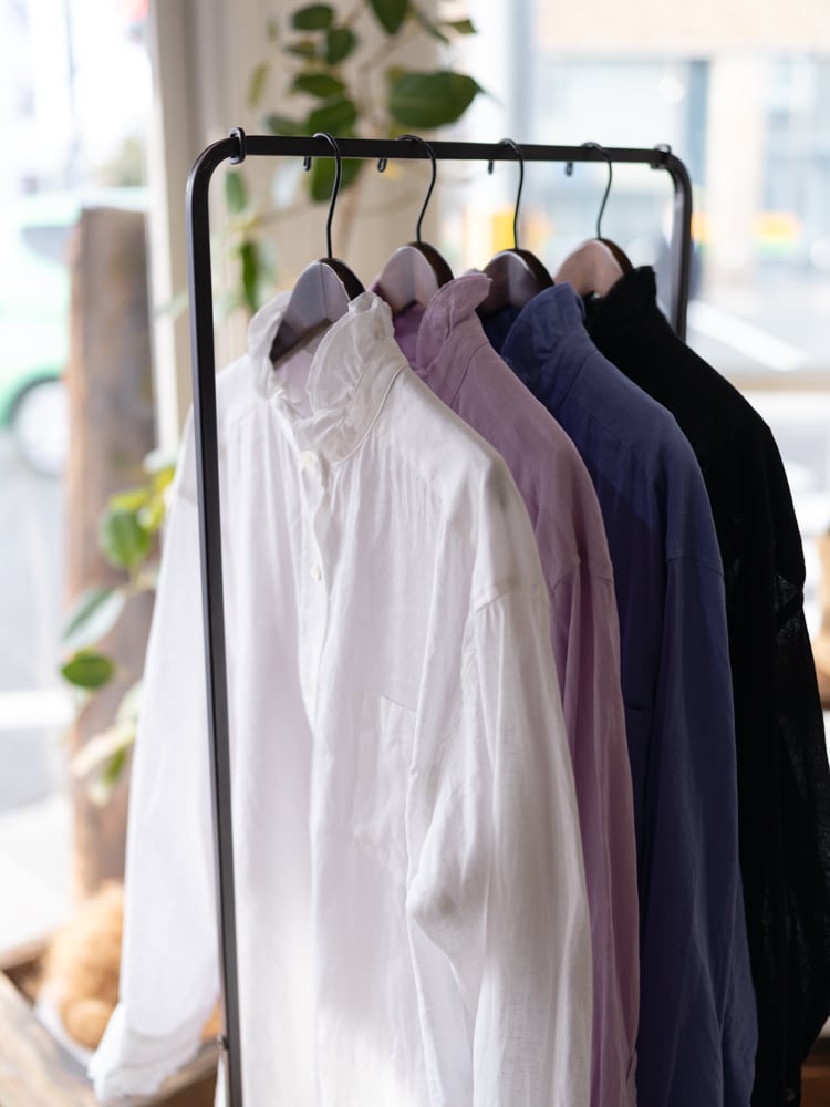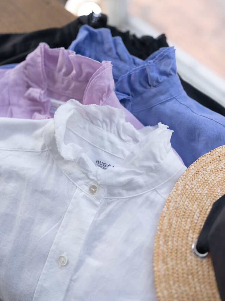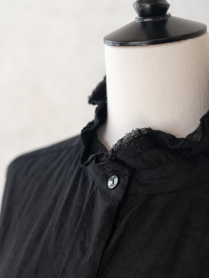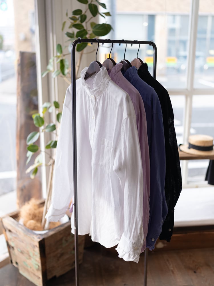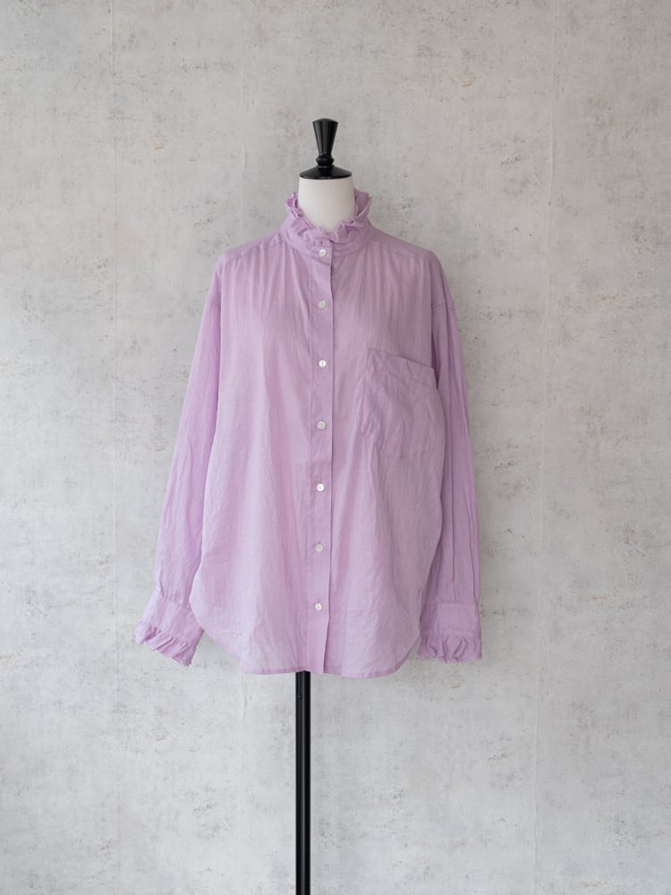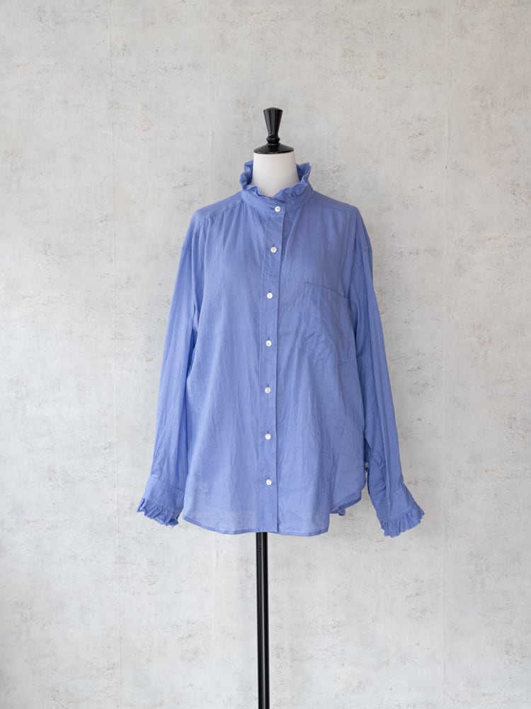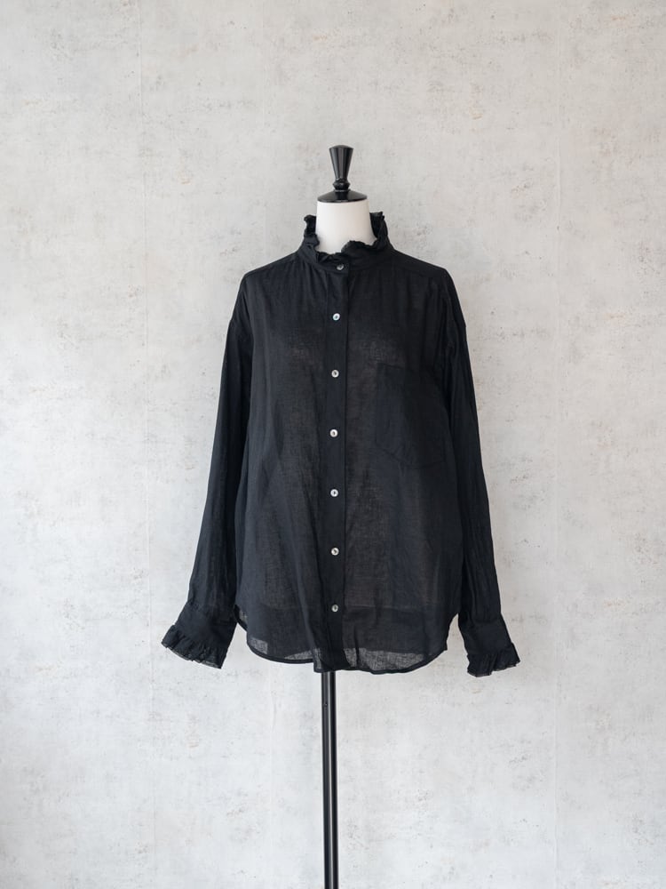 清涼感あふれるリネンコットンの生地で仕立てた、フリルカラーのスタンドシャツ。