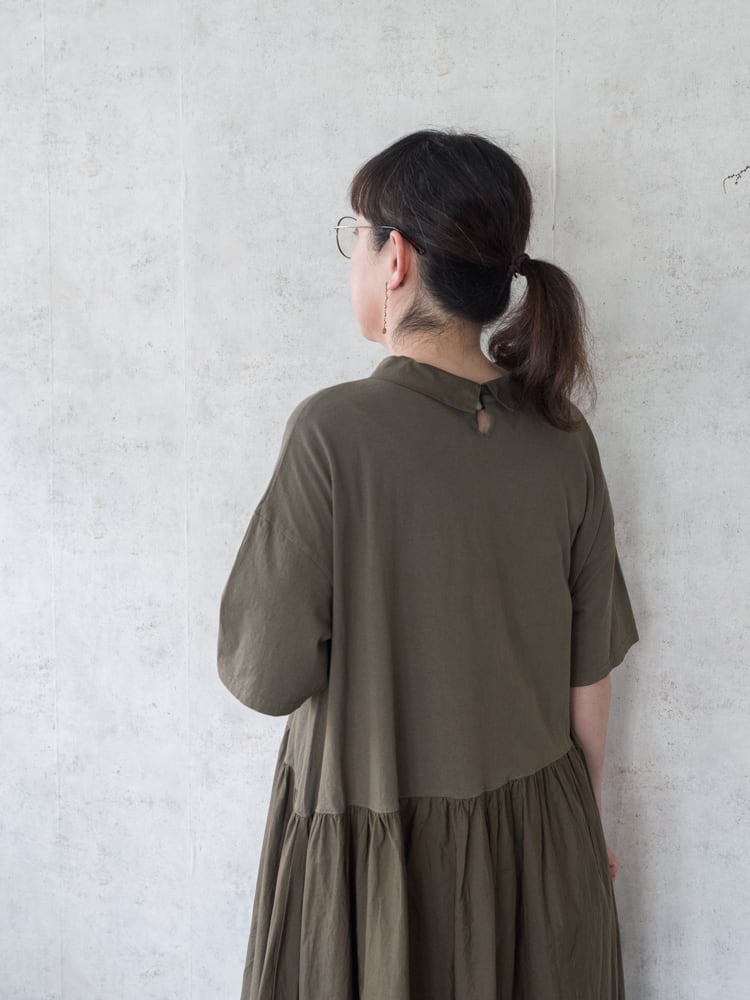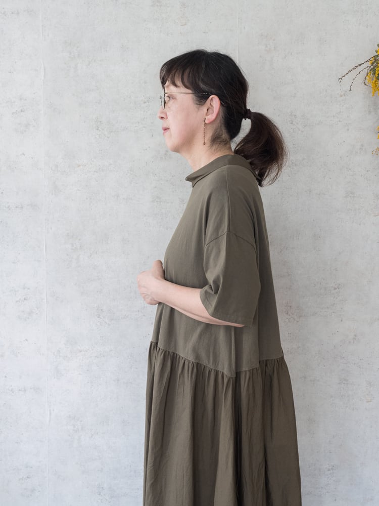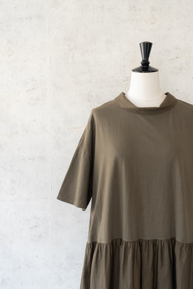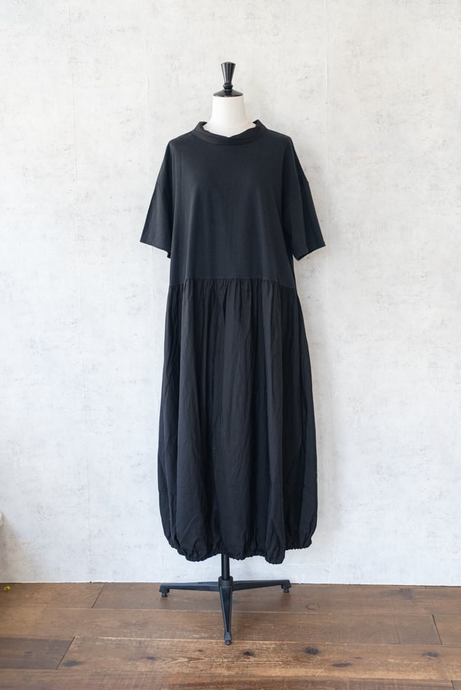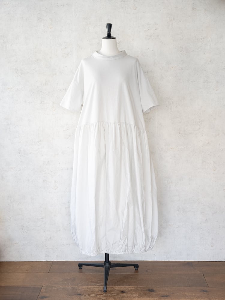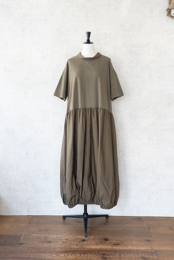 上半身はエーゲ海天竺、衿部分とスカート部分は布帛素材で切り替えられたグリンの人気スタイル、バルーンシルエットのワンピース。